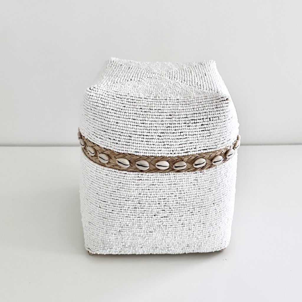 Høj Bali perle æske med shells – hvid – mellem H24 cm