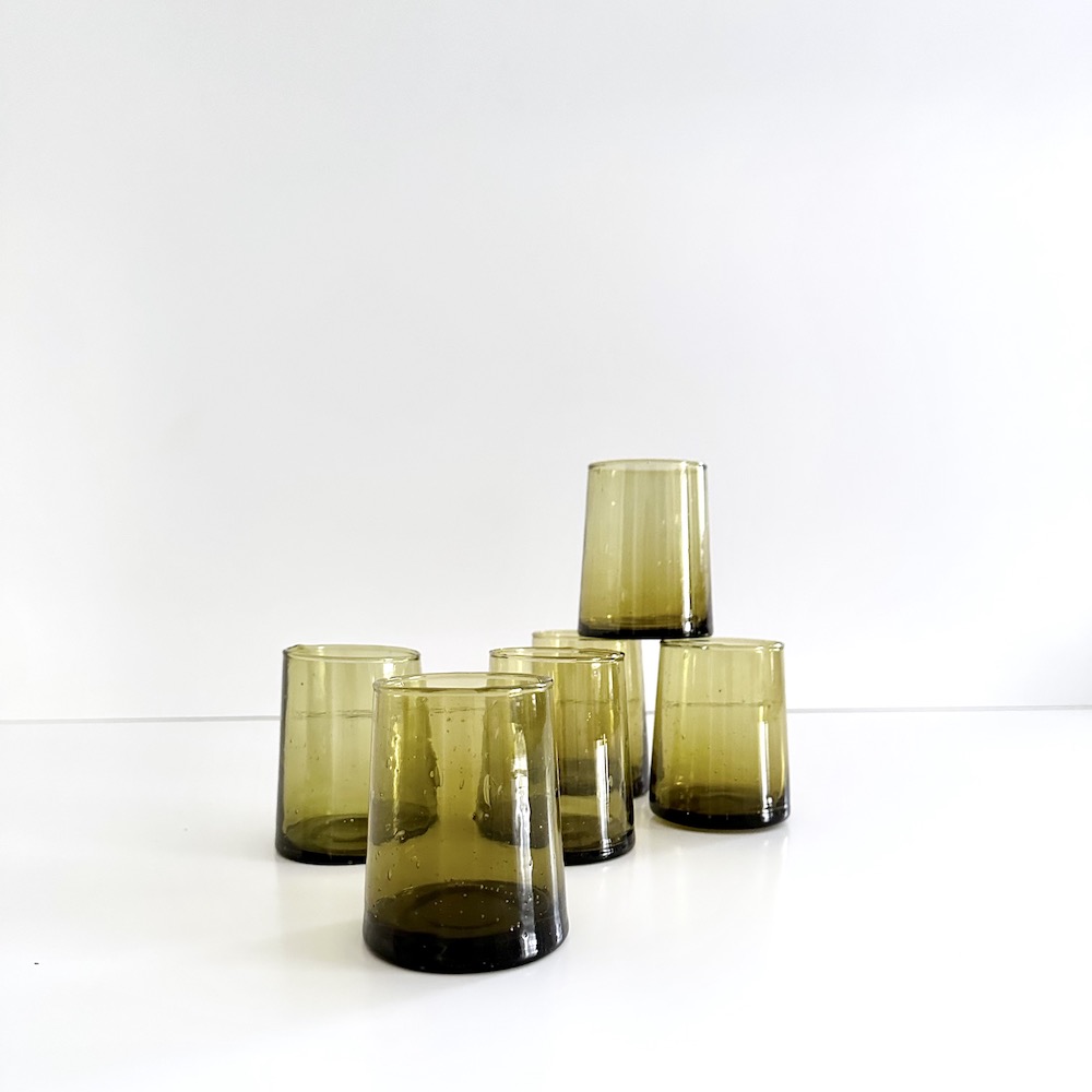 Det smukke Fez glas er mundblæst i genbrugsglas efter gamle traditioner fra de Marokkanske the- og middagsselskaber. Glasset kan vaskes i opvaskemaskinen, tåler varme drikke samt fyrfadslys. Glasset har en charmerende facon, der former sig lidt ind foroven. Det gør det velegnet både til hverdag og til fest på et veldækket bord i selskab med smukke vinglas. De små og mellem størrelsen er også velegnede til portionsanretninger for en lille forret eller dessert.
