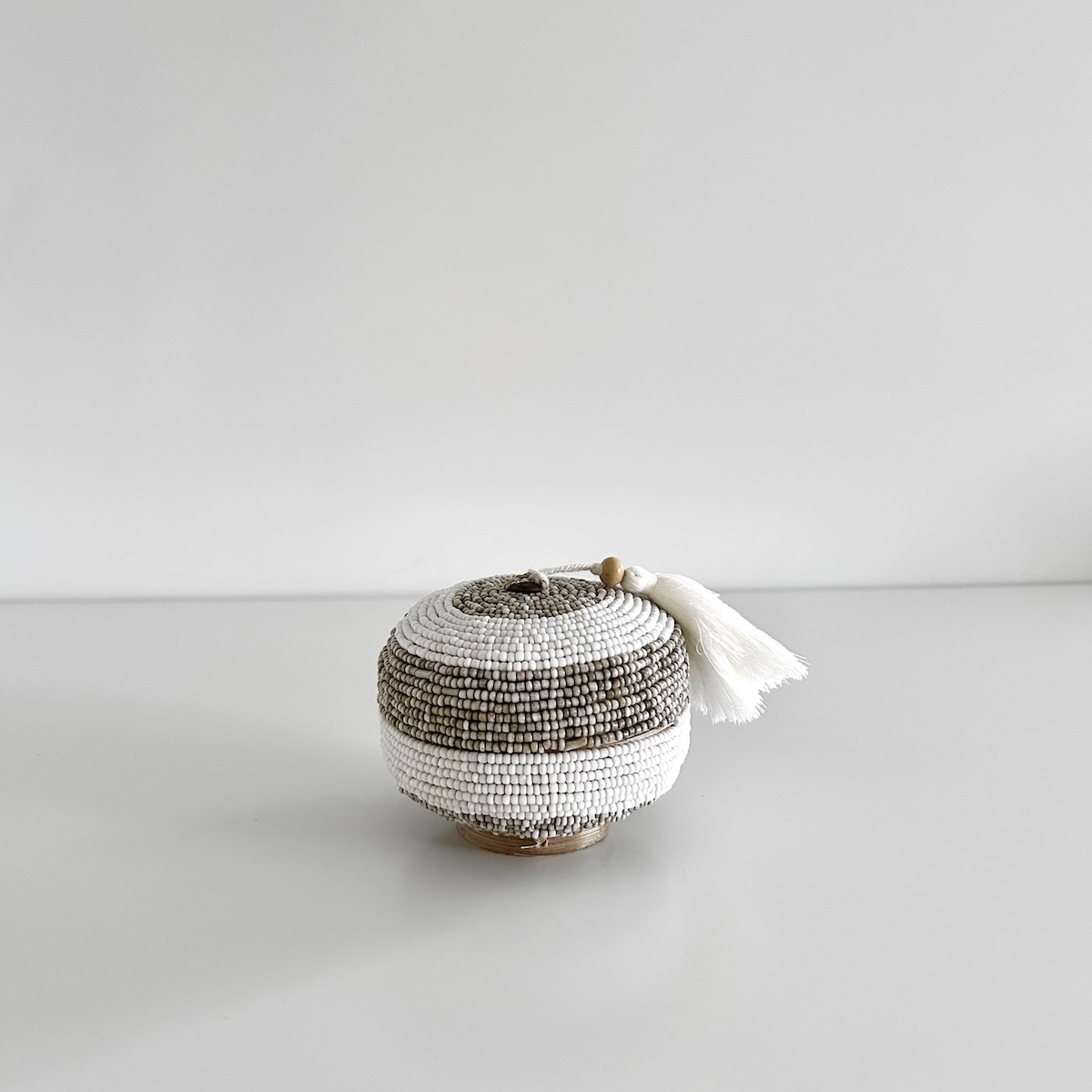 OPRINDELSE: Æsken er håndflettet på Bali og hver perle er påsyet i hånden. Selve æske typen anvendes oprindeligt til opbevaring af ris og andre madvarer mens den med perler påsyet anvendes til pynt og opbevaring af småting