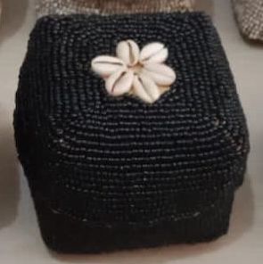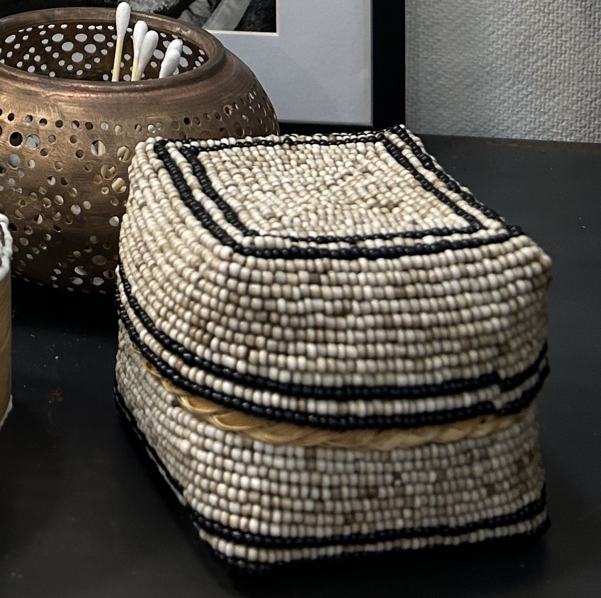 OPRINDELSE: Æsken er håndflettet på Bali og hver perle er påsyet i hånden. Selve æske typen anvendes oprindeligt til opbevaring af ris og andre madvarer mens den med perler påsyet anvendes til pynt og opbevaring af småting