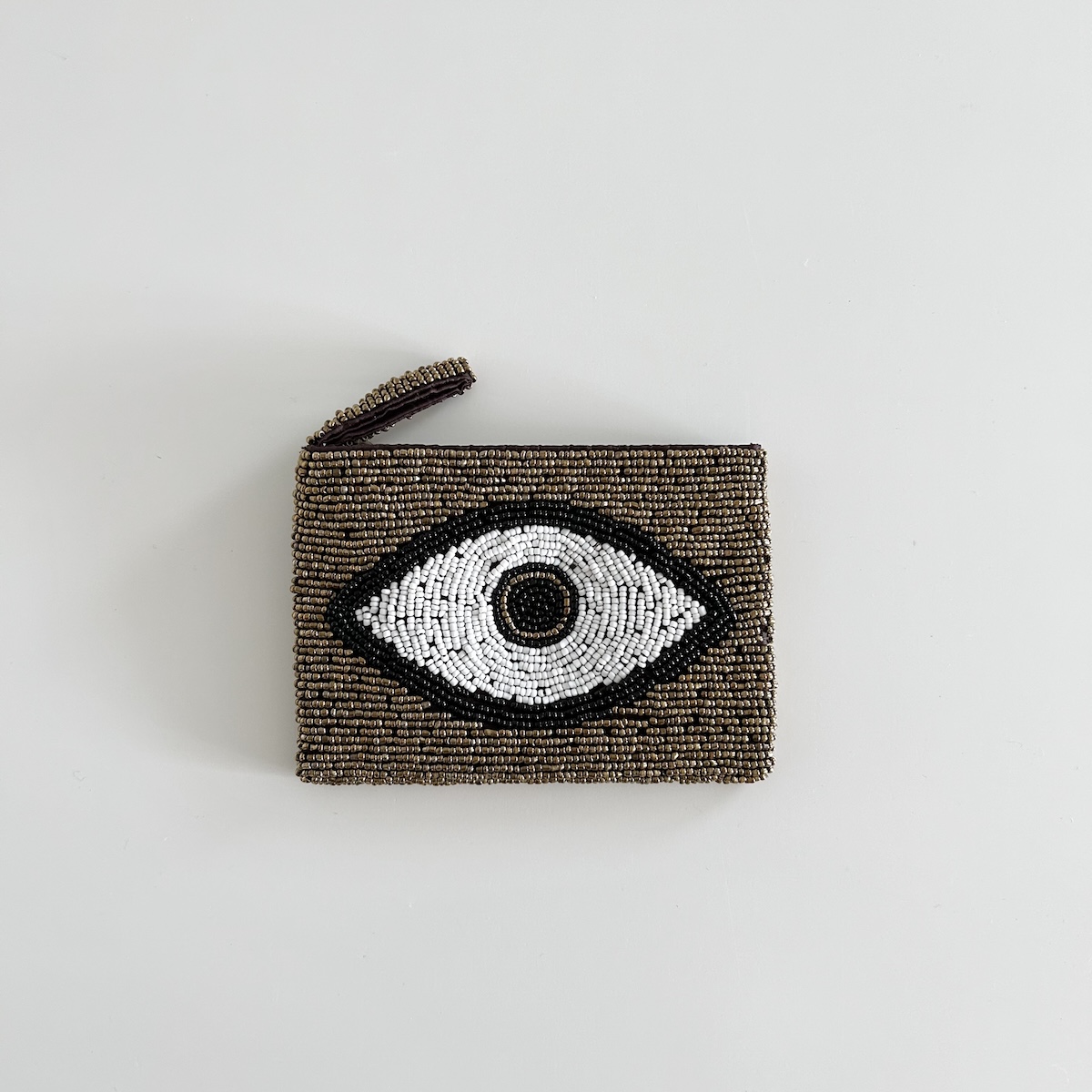 Bali perlepung med lynlås – All seeing eye STØRRELSE: L14 x 10 cm Bemærk: Da pungene er håndflettede kan målene variere: