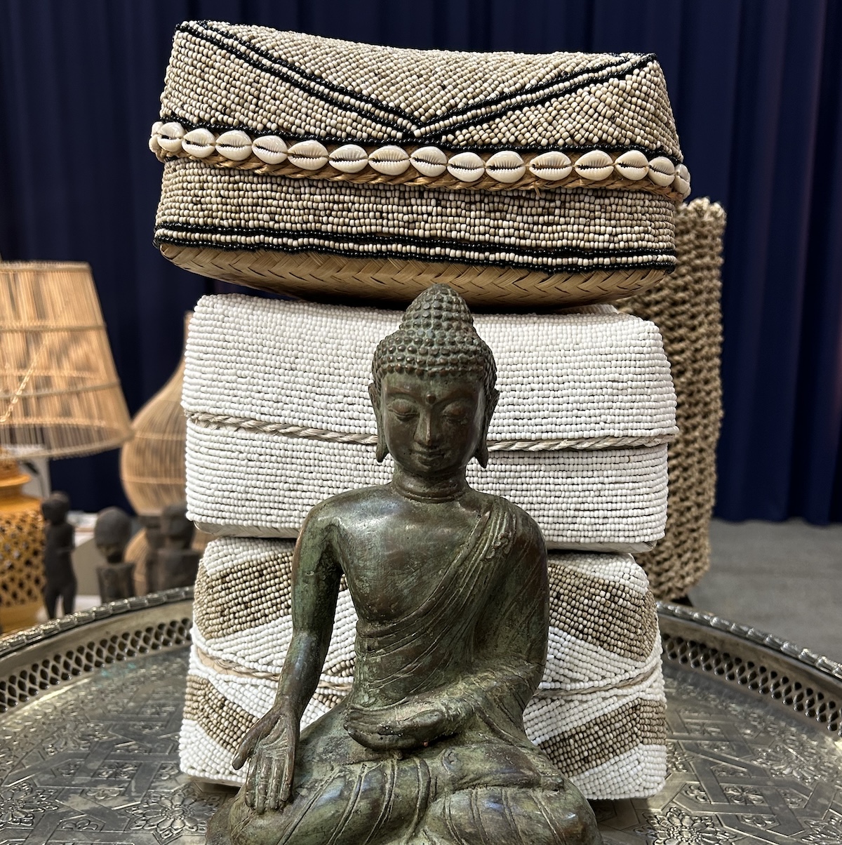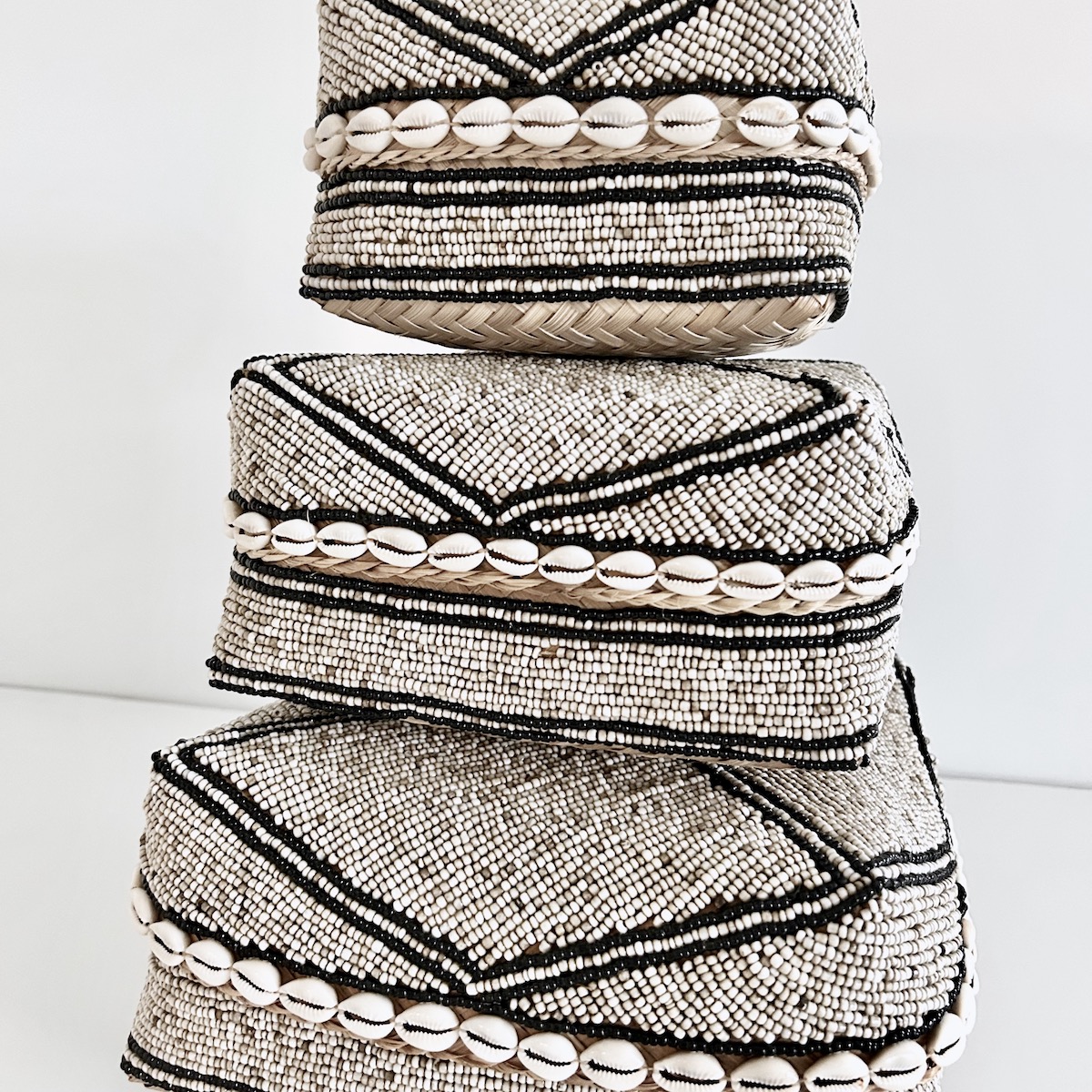 OPRINDELSE: Æsken er håndflettet på Bali og hver perle er påsyet i hånden. Selve æsken anvendes oprindeligt til opbevaring af ris og andre madvarer mens den med perler påsyet anvendes til opbevaring af forskellige ting fra dagligdagen.