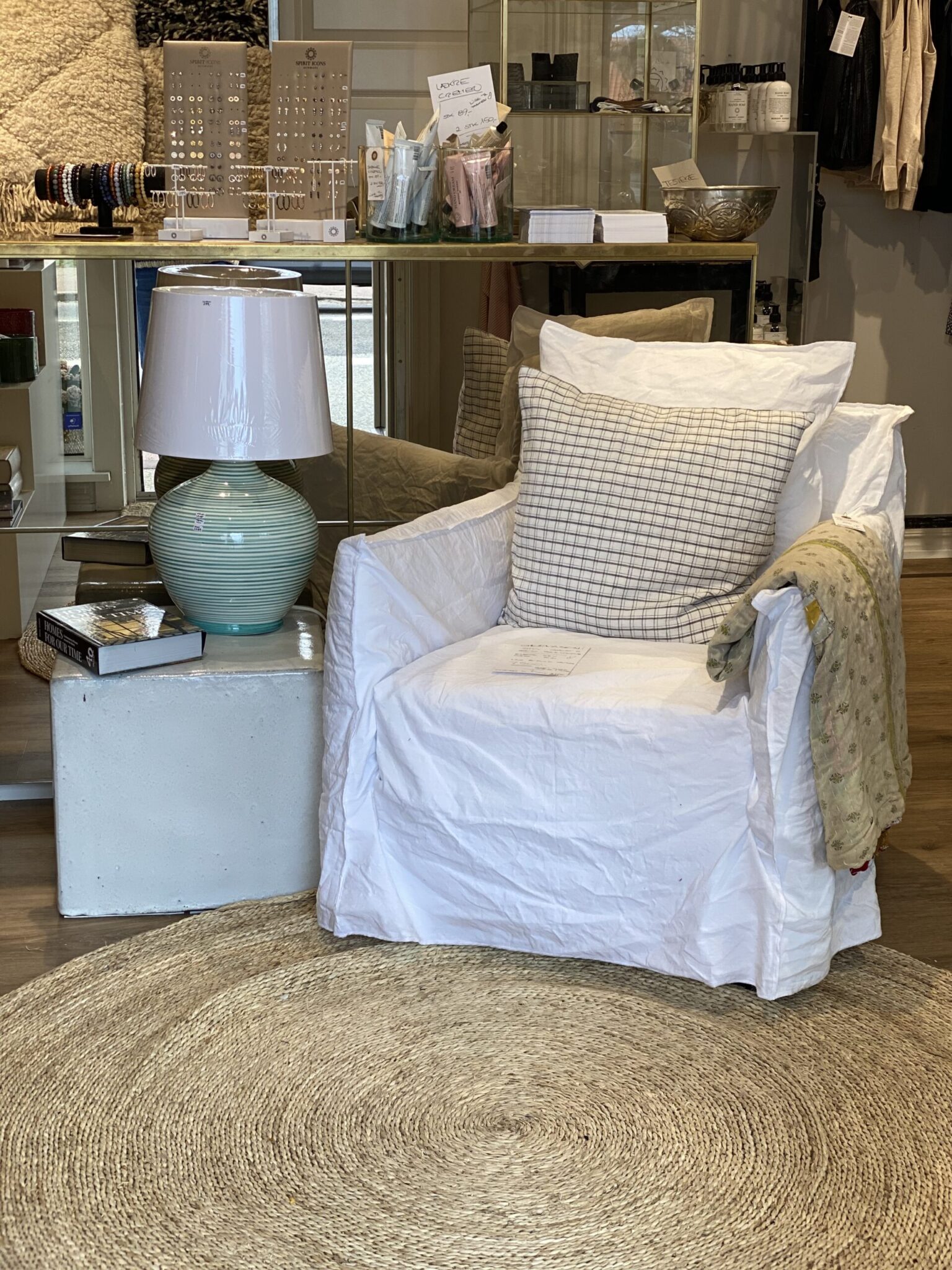Lænestolen har aftageligt betræk og er her vist med det klassiske hvide Lino Bianco betræk. Med det aftagelige betræk har du mulighed for at style den med andre stoftyper og farver, så den passer ind i dit hjem.