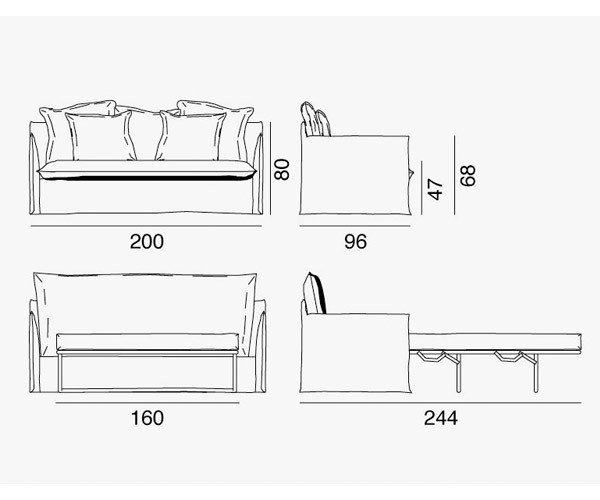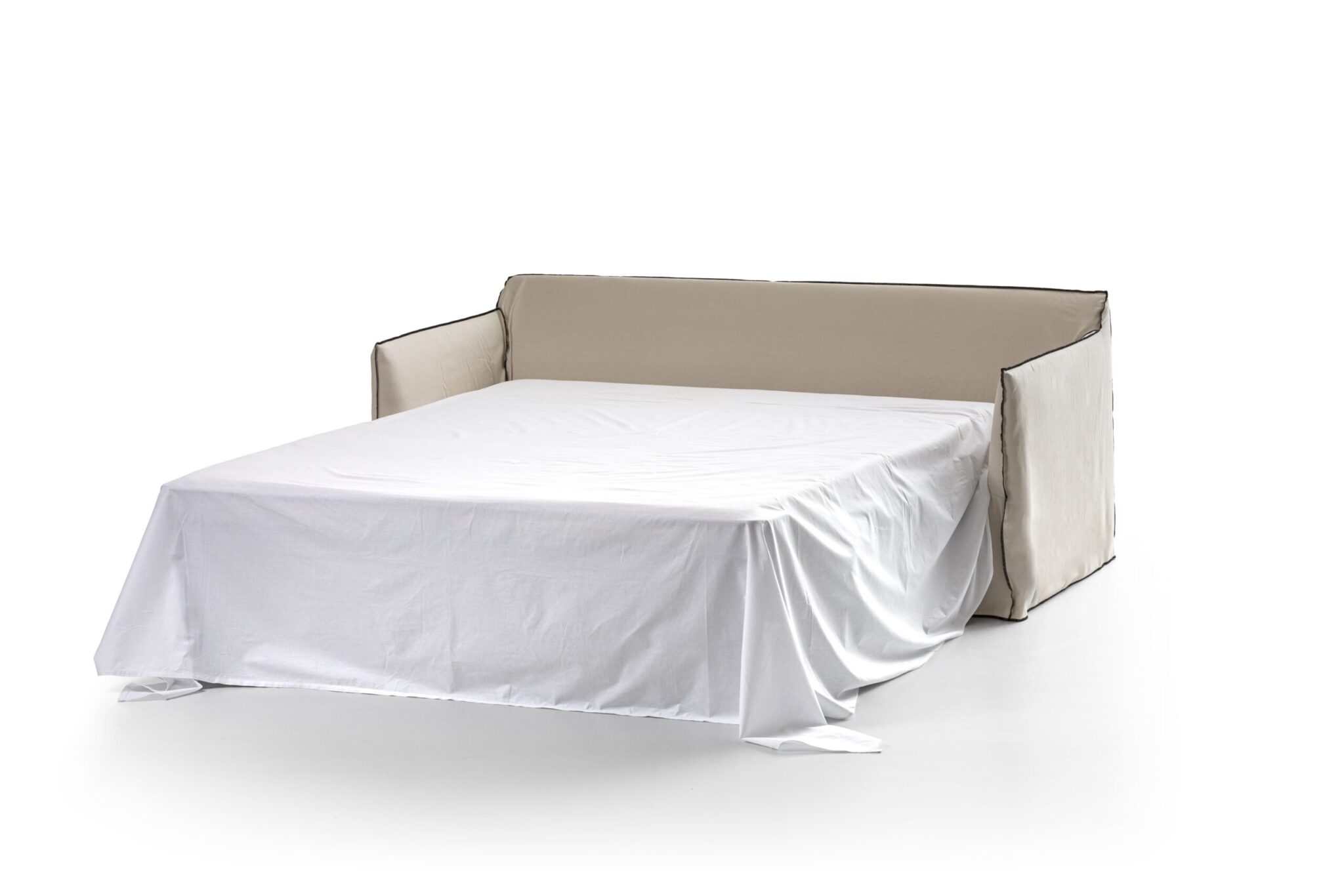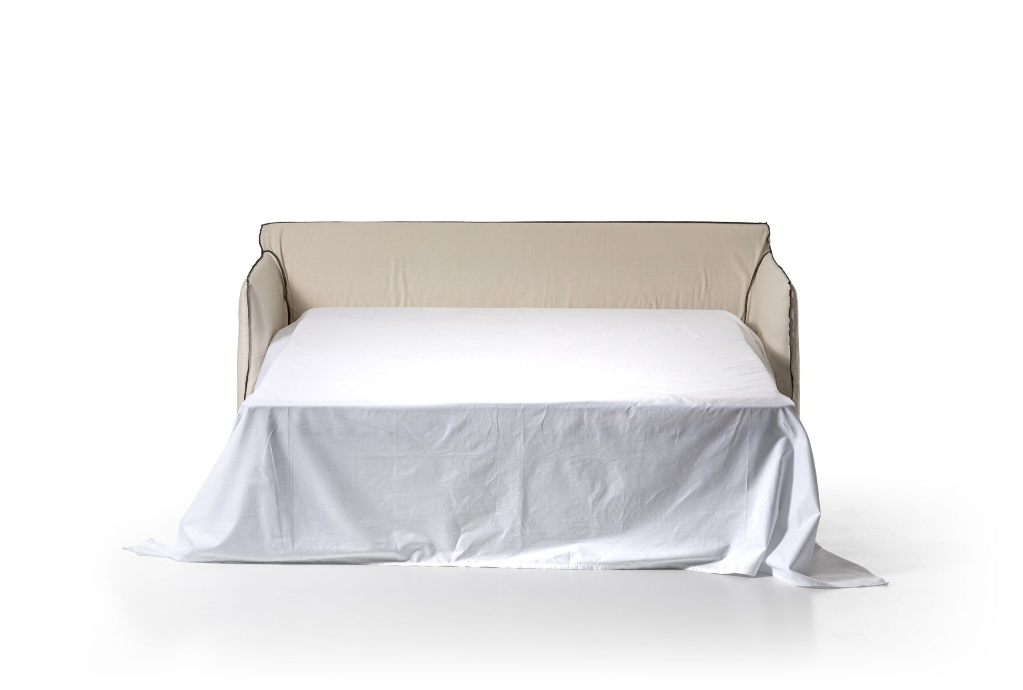 Gervasoni’s Ghost sovesofa er designet af italienske Paola Navone. Sofaen er både smuk og anvendelig at have stående i din stue eller et værelse. Den er opbygget med en trækonstruktion, med flere lag af polyuretan skum, hvilket gør den dejlig blød at sidde og ligge i. Med en lækker kraftig siddepude samt med støtte fra 5 bløde ryg puder, bliver man næsten helt omfavnet af sofaen. Super lækkert!. Sengestellet i metal ligger sammenfoldet med en tyk madras i koldskum under sofaens bløde siddehynde. Stellet glider let, når sengen skal slåes ud og ind. Og som en smart finesse bliver sofaens kraftige siddehynde lavet om til en lækker, stor ryg pude, der sættes op som ekstra hovedgærde, når sengen er udslået. Det giver en luksuriøs og lækker hotelagtig stemning.