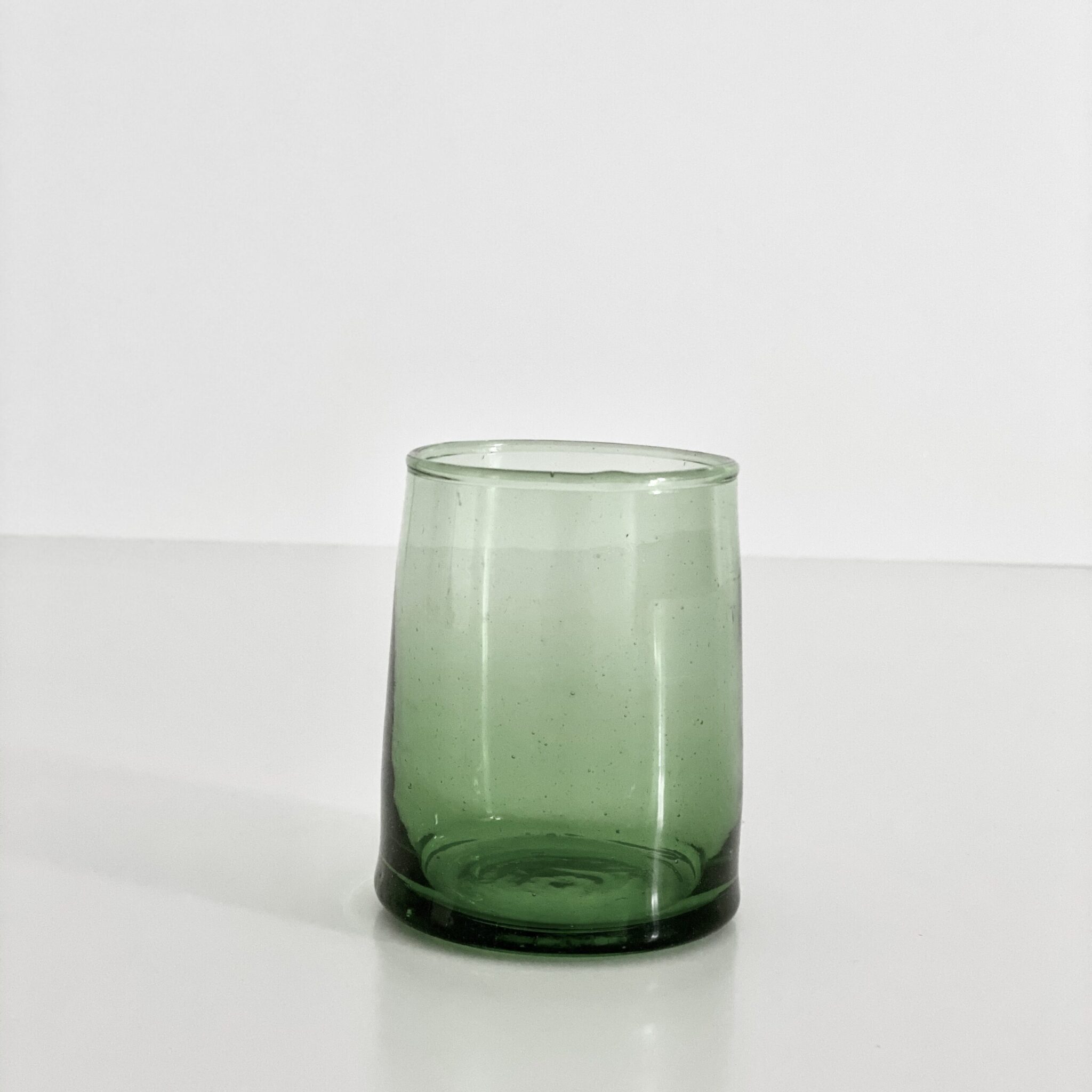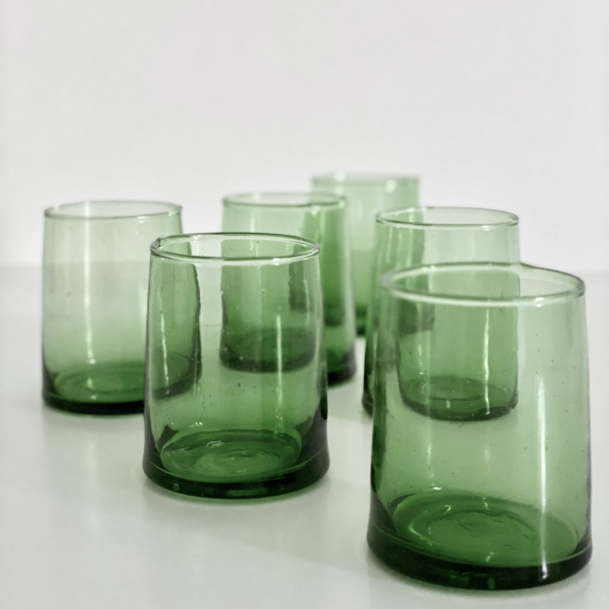 Fez glas – Le Verre recycled (M) Grønt 6 stk STØRRELSE: H9 cm. x Ø @6 cm. foroven / @7 cm. forneden MATERIALE: 100% genbrugs glas. Tåler både varme og kolde drikke. FARVER: Grønt glas. Fåes også i klart, blåt og brunt ORIGIN: Marokko siden 1946