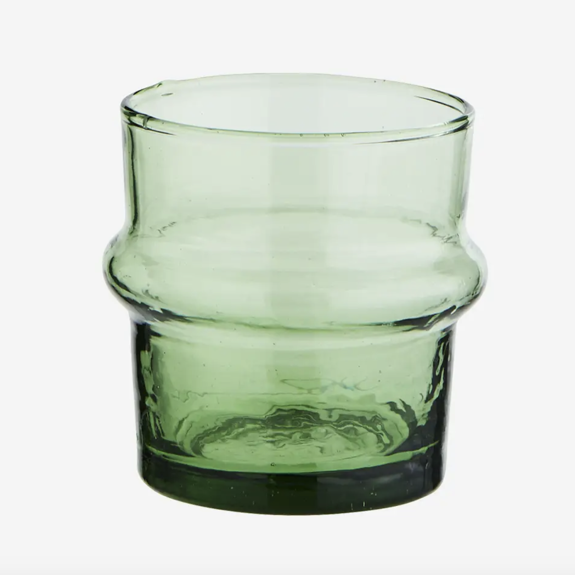 Glas – Marrakesh Grøn H6 cm (XS) – 6 stk STØRRELSE: H6 x Ø5,5 – 10 cl MATERIALE: 100% genbrugs glas. Tåler både varme og kolde drikke. FARVER: Grønt glas. Fåes også i olivenfarvet og klart glas ORIGIN: Marokko siden 1946
