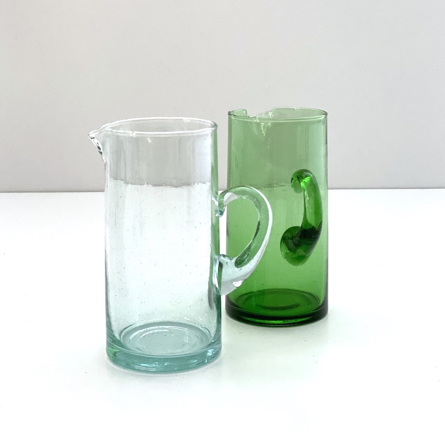 Skøn grøn glaskande med en kraftig hank. Kanden er mundblæst i recycled genbrugsglas efter gamle Marokkanske traditioner. Den tåler således både varme drikke og opvaskemaskine. Brug den til vand, saftevand, varm kakao, thé, gløgg, rødvin mm.