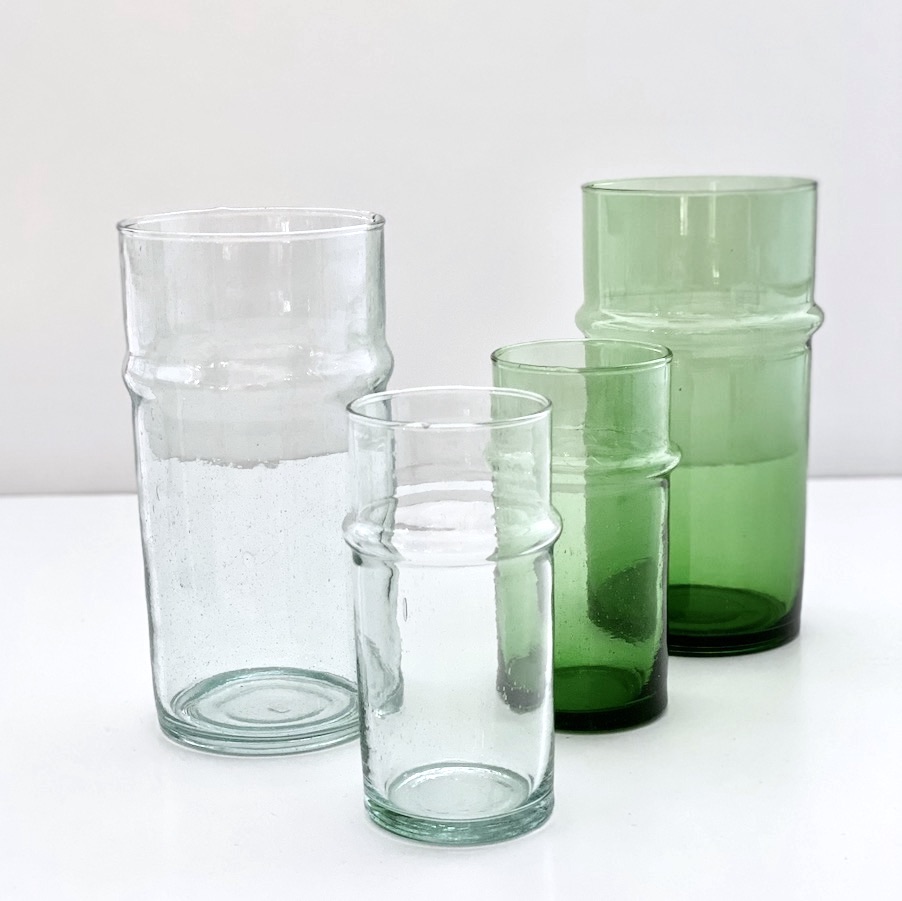 Glasvase ‘Agadir’ recycled grøn H20 cm STØRRELSE: H20 cm x Ø9,5 cm. Findes også i en større model MATERIALE: Mundblæst i 100% genbrugs glas. Tåler stearinlys. FARVER: Grønt glas. Fåes også i klart klas ORIGIN: Marokko siden 1946