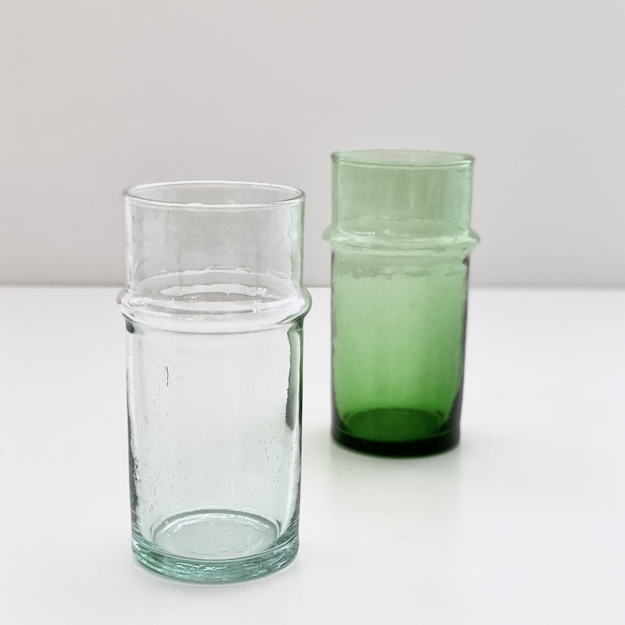 Hver vase er unik, da de er håndlavet og mundblæst i genbrugs glas. Bobler, ujævnheder og forskelle i tykkelser, størrelser og farvenuancer forekommer og anses for at være en del af vasens historie og charme. Med denne vase støtter du op om de stolte håndværkstraditioner i Marokko og bidrager til at bevare arbejdspladser og indtjening for familierne i lokalsamfundet.