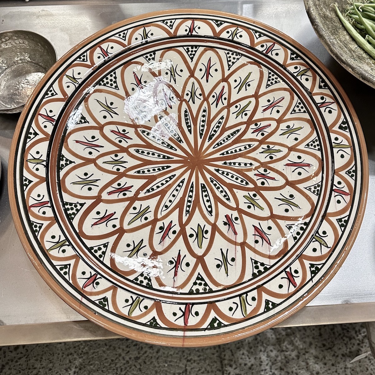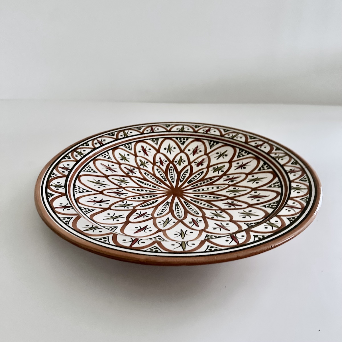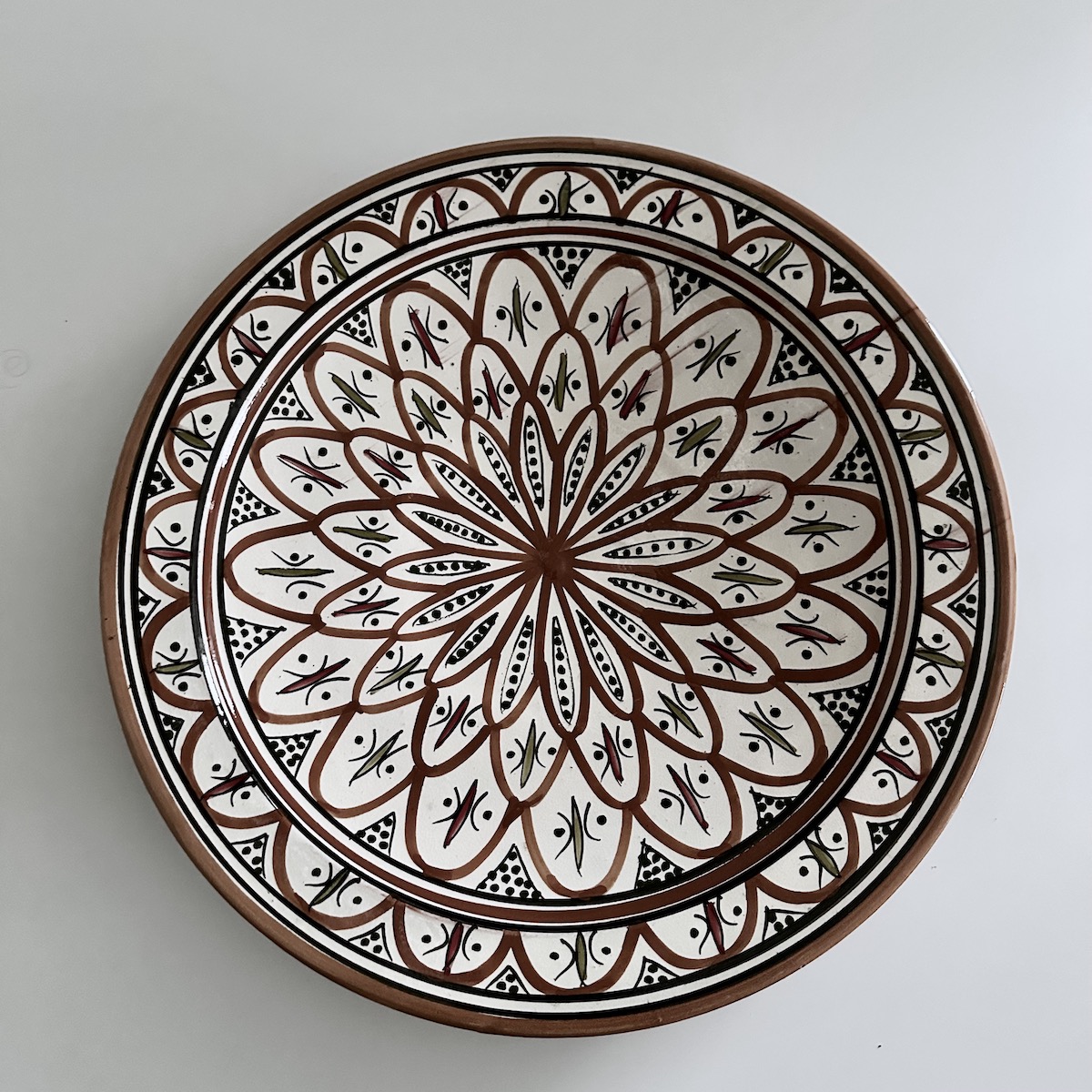 Det smukke keramik fad er håndlavet af lokale keramikere i Kongeriget Marokko. Fadet er er formet og brændt efter gamle, stolte traditioner i ler fra Moder Natur; Og særligt for dette fad har den lokale keramiker efterfølgende påført en tyk glasur med smukke ikoner og symboler i varme farver. Hvert eneste stykke keramik har sin egen charmerende historie og sit eget udtryk. Som et lille soul letter der videregives til den heldige modtager fra den lokale keramiker . Spred den smukke energi i dine rum eller til en, du holder af.