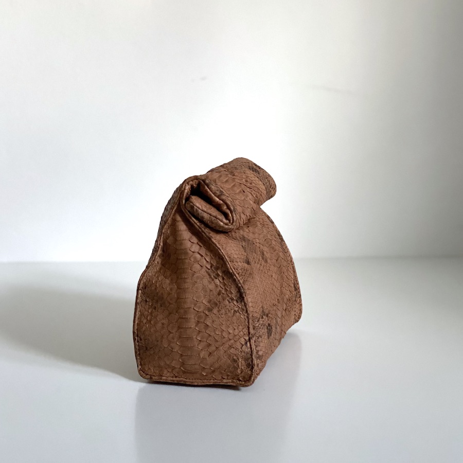 Lækker boho håndtaske i 100% python slange skind håndsyet i Indonesien under bæredygtige vilkår. En skøn taske i et helt unikt “wrap” design, der altid får opmærksomhed både til hverdag og fest. Tasken har et stort rum samt et mindre rum med lynlås, hvor der er plads til kreditkort, læbestift mm. Det store rum har plads til både mobil telefon, make-up pung/pung, en lille notesbog mm. Tasken er både elegant og bohemian cool at have under armen eller i hånden og passer både til et par jeans og en T-shirt samt til det lækre festtøj. Du kan være helt sikker på, at det er en taske, der bliver lagt mærke til og beundret af mange:). Fåes i flere farver.