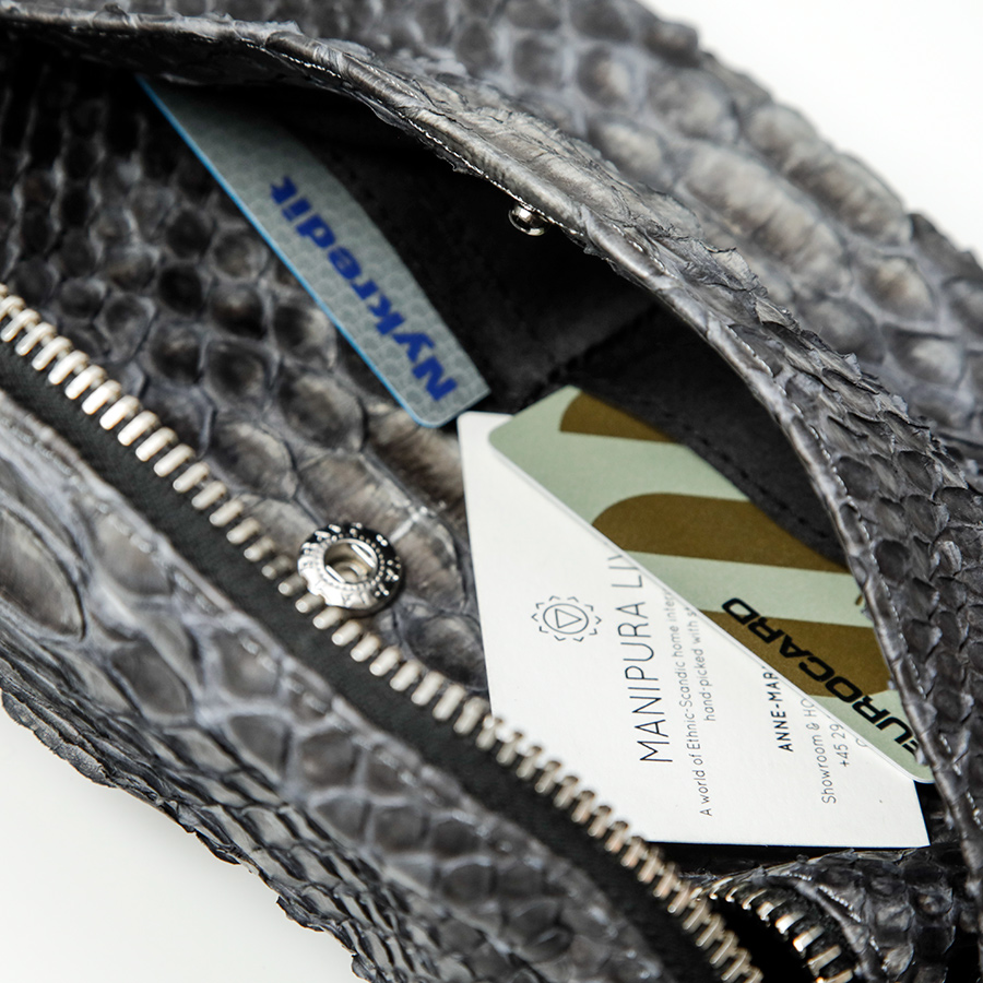OPRINDELSE: Frembragt og bearbejdet i hånden i Indonesien. Alle lynlåse er fra Italien. Alt pythonskind er frembragt, bearbejdet og håndsyet i Indonesien under bæredygtige og fuldt legale vilkår. Skindet kommer fra den ikke-truede dyreart i Indonesien, Python Reticulatus. Slangerne vokser op i de store Jungleområder på Java og Sumatra, hvor lokale jægere igennem generationer har opdrevet slangerne til brug for mad, medicin, olie og skind. Kun fuldt udvoksede slanger udvælges og alt bruges. Intet går til spilde! Vi samarbejder med et lille, Indonesisk familieforetagende på Java, hvor de voksne kvinder og mænd igennem generationer har viderebragt deres særlige ekspertise og viden om bearbejdning af slanger og slangeskind. Sammen med et lille hold af kvalificerede medarbejdere laves alt i hånden efter gamle traditioner og teknikker, lige fra bearbejdning af skindet med udskæring og farvning til limning samt syning på en hånddrevet symaskine. Med en Kundalini taske støtter du op om gamle kulturelle traditioner og lokale familiers levebrød i Indonesien. VEDLIGEHOLDELSE: Kan aftørres med en blød klud opvredet i varmt vand Med en Kundalini taske og accessory har du et produkt for livet, der blot bliver blødere og smukkere ved brug. Vi anbefaler ikke brug af kunstige kemikalier og imprægnering. Lad skindets patina tale sin egen historie over tid. Undgå for meget direkte sol og regn.