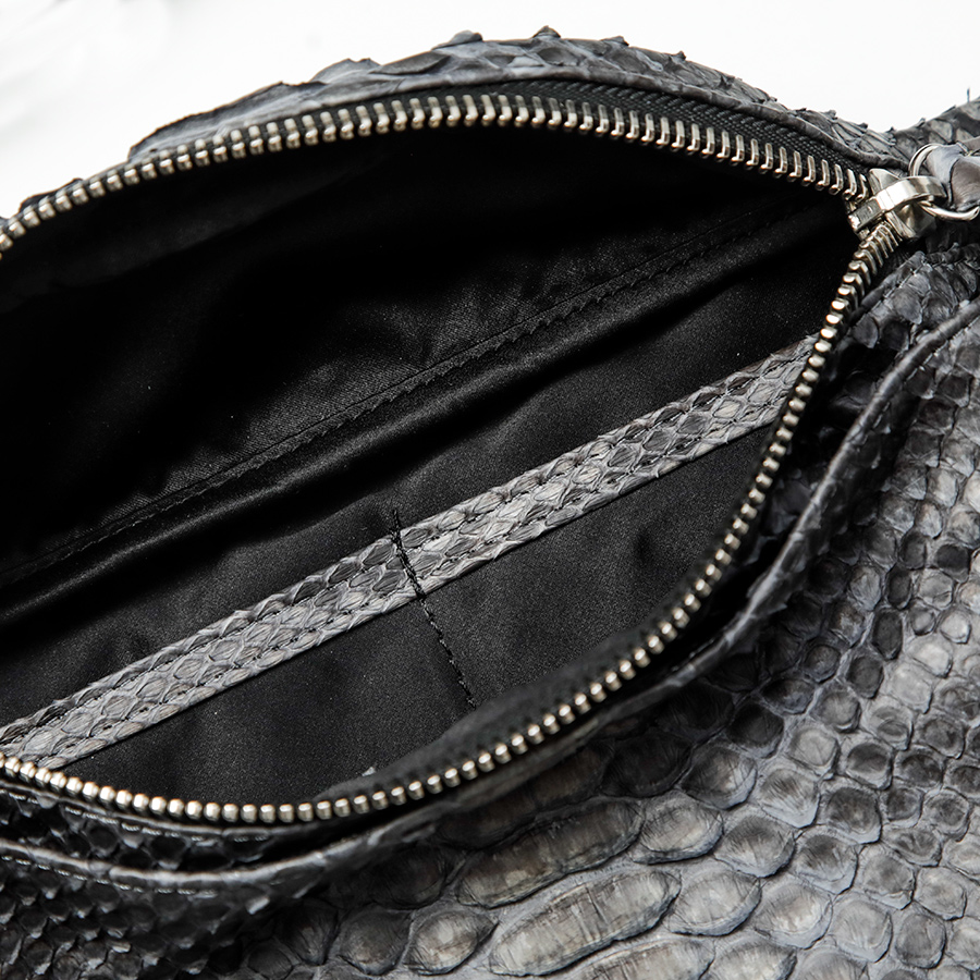 Lækker og rå cross body bum bag taske i 100% python slange skind, håndsyet i Indonesien under bæredygtige vilkår. Tasken er smuk og rummelig med 3 sektioner og mange små rum. Den er populær blandt både mænd og kvinder i alle aldre for det unikke one size design og de mange anvendelsesmuligheder. Tag den lange rem over skulderen og bær tasken foran dig, bagpå, på hoften eller gå med den i hånden. Perfekt til sikker opbevaring af penge, solbriller, make-up, pas, billetter, pung mm på festivaller, byture, strandture, rejser, gåture i naturen, cafébesøg, natklubber, receptioner og meget mere. Fåes i flere farver.