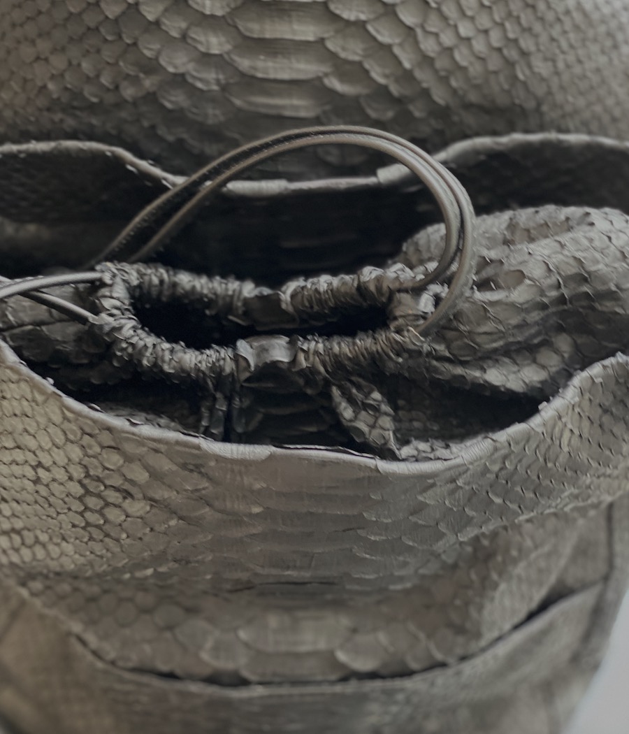 Helt unik, smuk og rå Kundalini City Slang skuldertaske håndsyet i 100% snake skind under bæredygtige vilkår. Taskens særlige karakteristika er den enkle lidt lange facon kombineret med en lækker, blød mulepose i rent skind med snører, der er påsyet øverst på taskens indvendige side. Muleposen fungerer som en charmerende lukkefunktion af tasken, når der er behov. Og efter behov kan den forlænge tasken med yderligere 10 cm. Lidt som en chick rygsæk. Ønsker du ikke at bruge muleposen stopper du den blot ned i tasken.