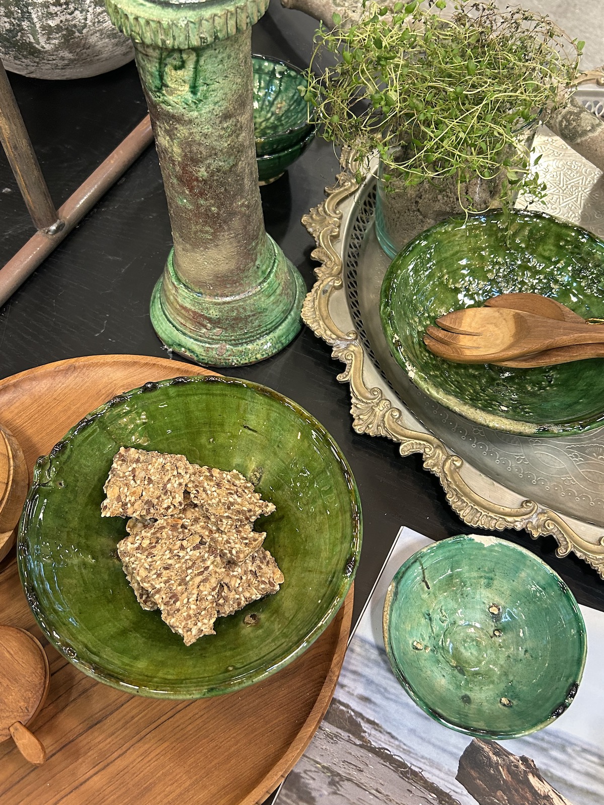 OPRINDELSE: Den unikke keramik er skabt af en lokal keramiker, der bor og arbejder i den lille by, Tamegroute ved Draa flod dalen i det sydlige Marokko. Vi har fundet den dygtige keramiker i samarbejde med en af vores marokkanske soul partnere. Tamegroute keramikken hører blandt de ældste håndværkstraditioner i Marokko. Det gamle craftsmanship skabes ud fra en unik proces hvor keramikken formes af ler fra moder natur der tørrer i store, udgravede gryder i jorden og efterfølgende brændes over åben ild i en af de 7 udendørs ovne, der deles af byens keramikere.