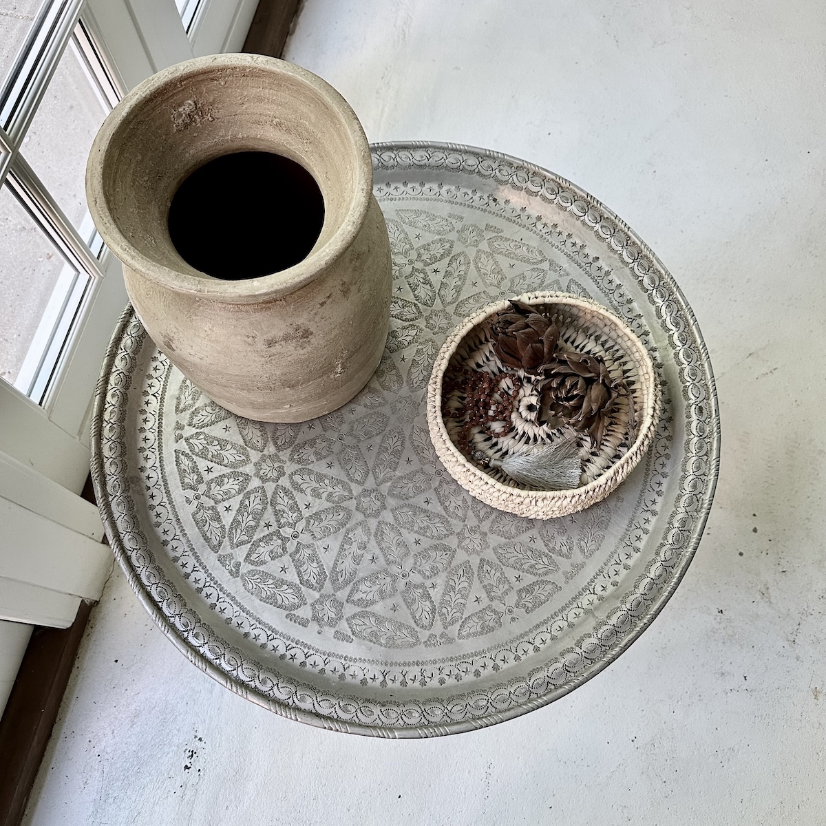 Marokkansk bakkebord m/aluminium fad Ø65 cm – vintage STØRRELSE: H62 x Ø65 cm MATERIALE: Fad i hamret aluminium – vintage. Stel i sort-pulveriseret jern – nylavet i Marokko.  ORIGIN: Vintage fad oprindeligt anvendt i en husstand i Marokko. Håndlavet efter gamle traditioner af en lokal håndværker i Marokko. Opkøbt og istandsat i en lokal familieejet workshop i Marrakesh.