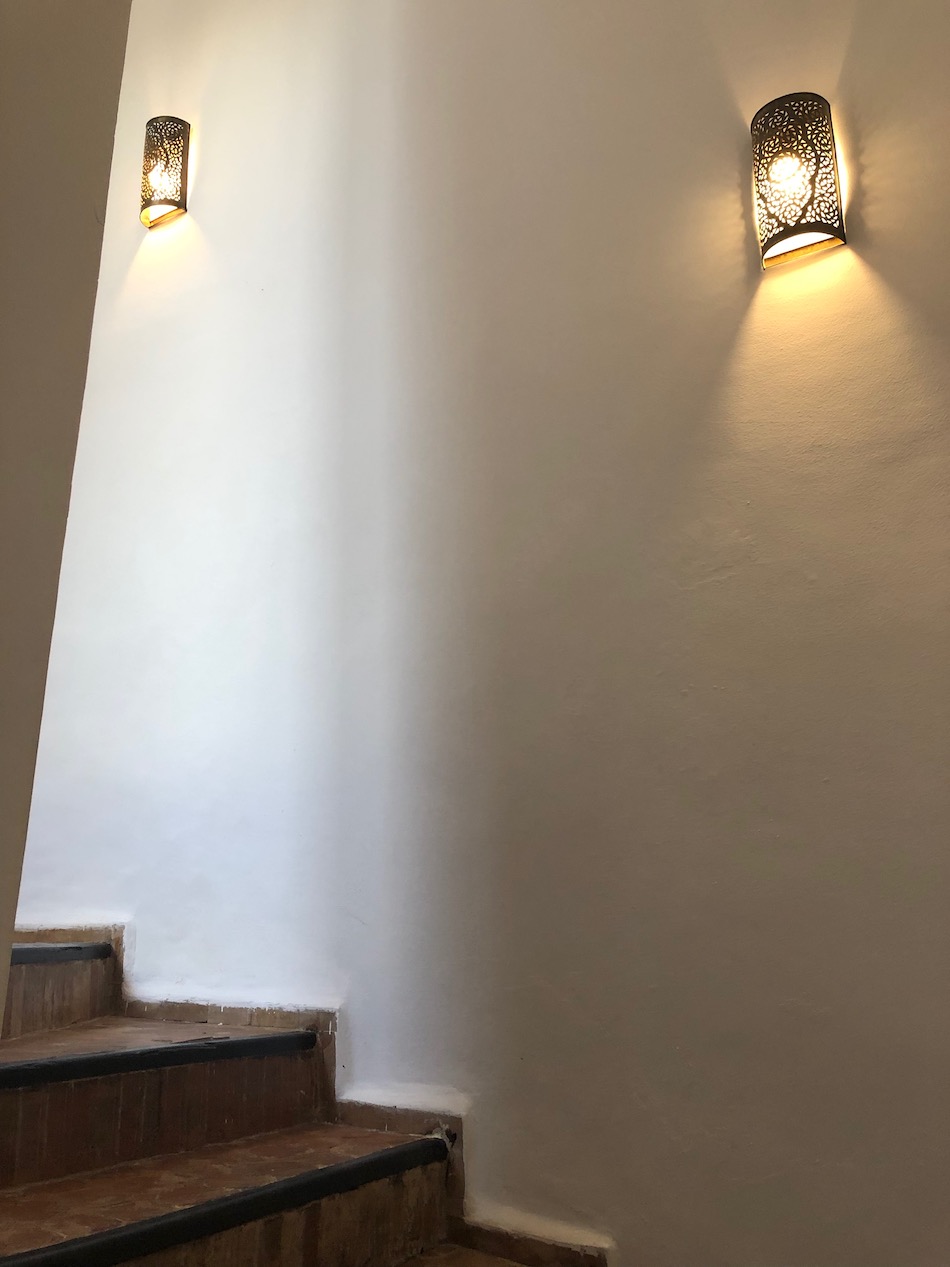 Den charmerende aflange væglampe er håndlavet i messing af 2 brødre i en lille, Marrokansk shop. De smukke skærme anvendes typiske som lyskilde i de lokale huse og smukke Riads i Marokko.