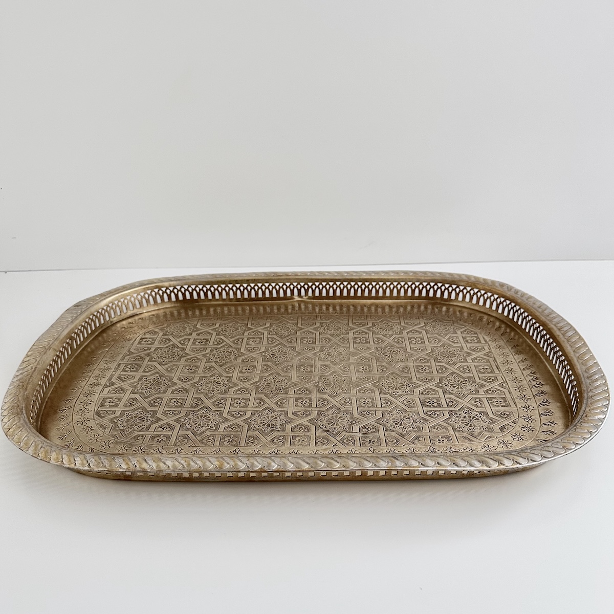 Den gamle vintage bakke har traditionelt været anvendt som the- og serverings fad i en Marokkansk husstand. Her er tale om en af de helt ‘rigtige’, gamle serveringsbakker fra Marokko – et UNIKA fund! Den er i fin stand med netop den patina, der gør den lækker og fyldt med sjæl.