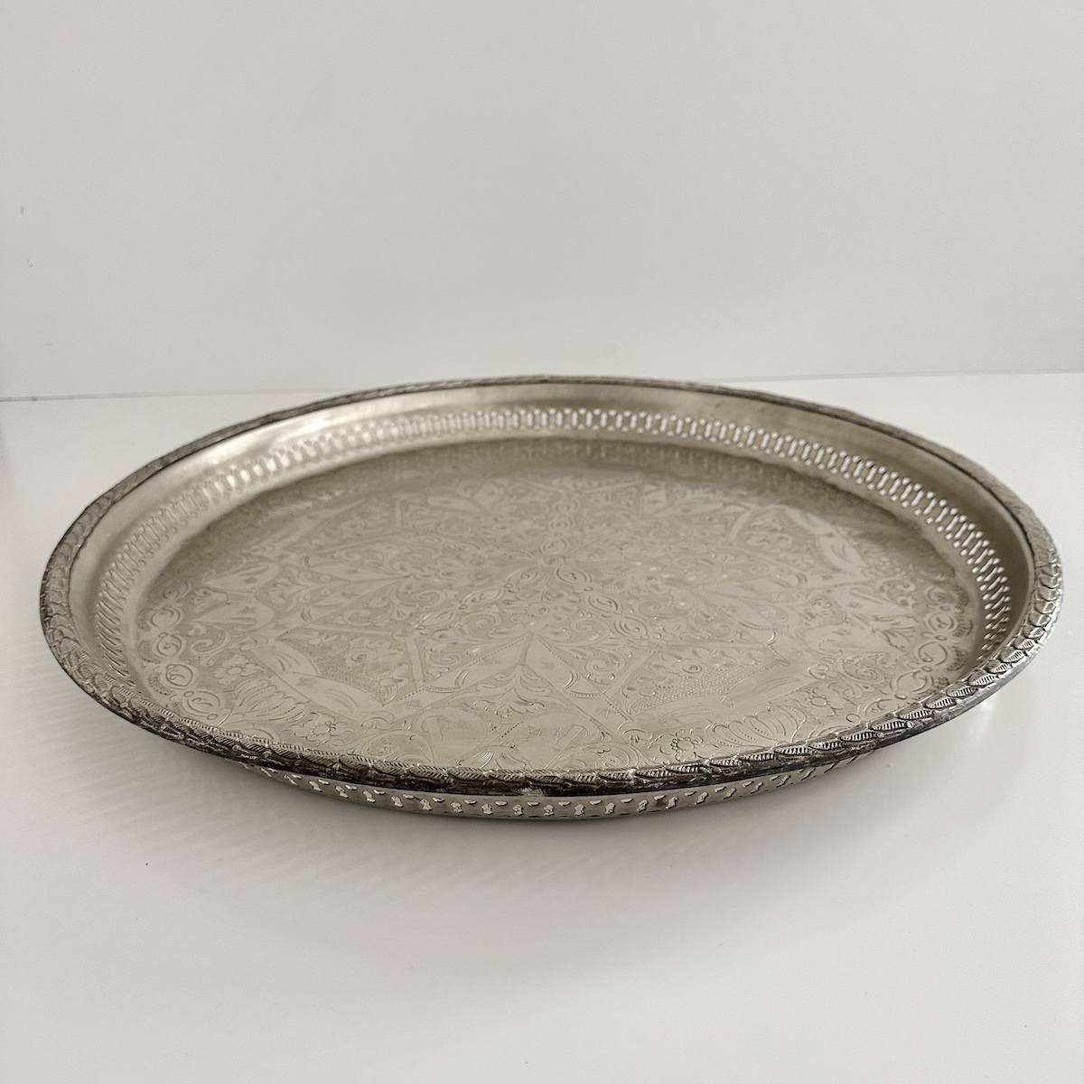Marokkansk vintage fad Ø54 cm – nysølv STØRRELSE: Ø54 cm VÆGT: @2,5 Kg. MATERIALE: Håndlavet i gammelt nysølv/nikkelsølv, der er en unik legering af primært kobber samt nikkel og zink, bly, tin og jern. Farven kendes som den smukke, klassiske ‘sølvfarve’.  ORIGIN: Vintage fad oprindeligt anvendt i en husstand i Marokko – ca. 60 år gammelt. Håndlavet efter gamle traditioner af en lokal håndværker i Marokko. Opkøbt og istandsat i en lokal familieejet workshop i Marrakesh.