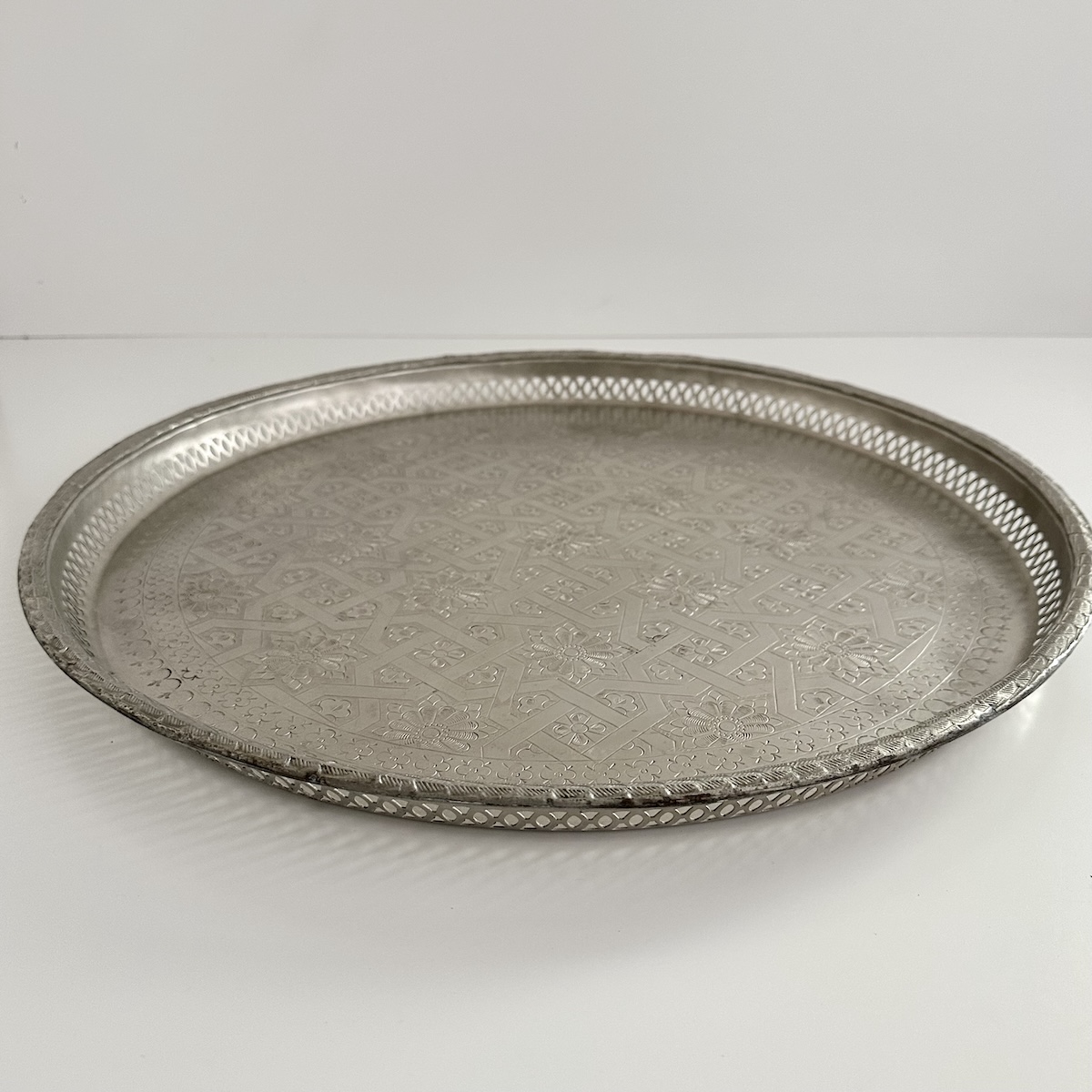 Marokkansk vintage fad Ø54 cm – nysølv STØRRELSE: Ø 54 cm VÆGT: @2-2,5 Kg. MATERIALE: Håndlavet i gammelt nysølv/nikkelsølv, der er en unik legering af primært kobber samt nikkel og zink, bly, tin og jern. Farven kendes som den smukke, klassiske ‘sølvfarve’.  ORIGIN: Vintage fad oprindeligt anvendt i en husstand i Marokko – ca. 60 år gammelt. Håndlavet efter gamle traditioner af en lokal håndværker i Marokko. Opkøbt og istandsat i en lokal familieejet workshop i Marrakesh.