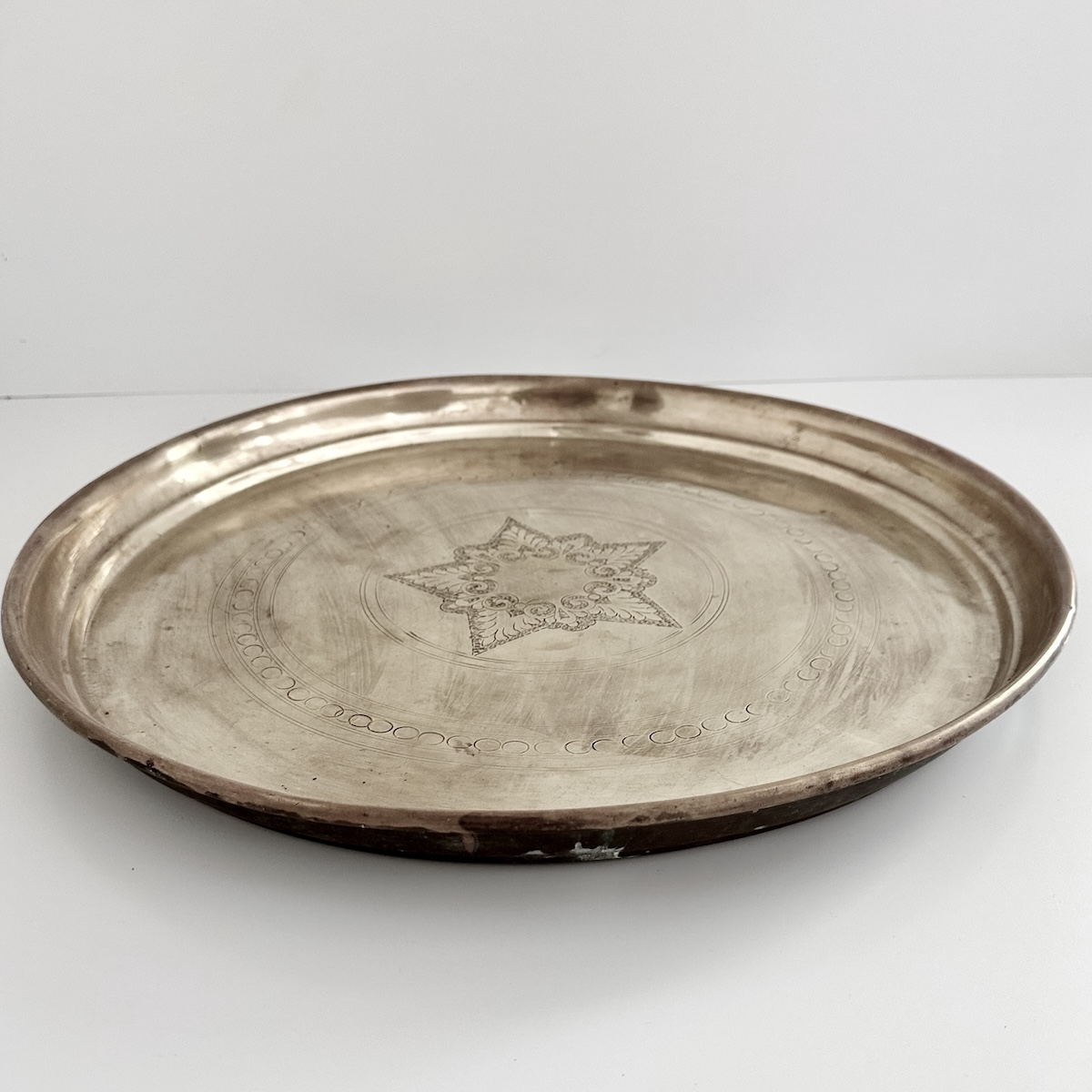 Marokkansk vintage fad Ø62 cm – messing STØRRELSE: Ø62 cm x H3,5 VÆGT: ca. 2,5 kg.  MATERIALE: Håndlavet i messing. UNIKA FUND!! ORIGIN: Vintage fad oprindeligt anvendt i en husstand i Marokko – ca. 60 år gammelt. Håndlavet efter gamle traditioner af en lokal håndværker i Marokko. Opkøbt og istandsat i en lokal familieejet workshop i Marrakesh.