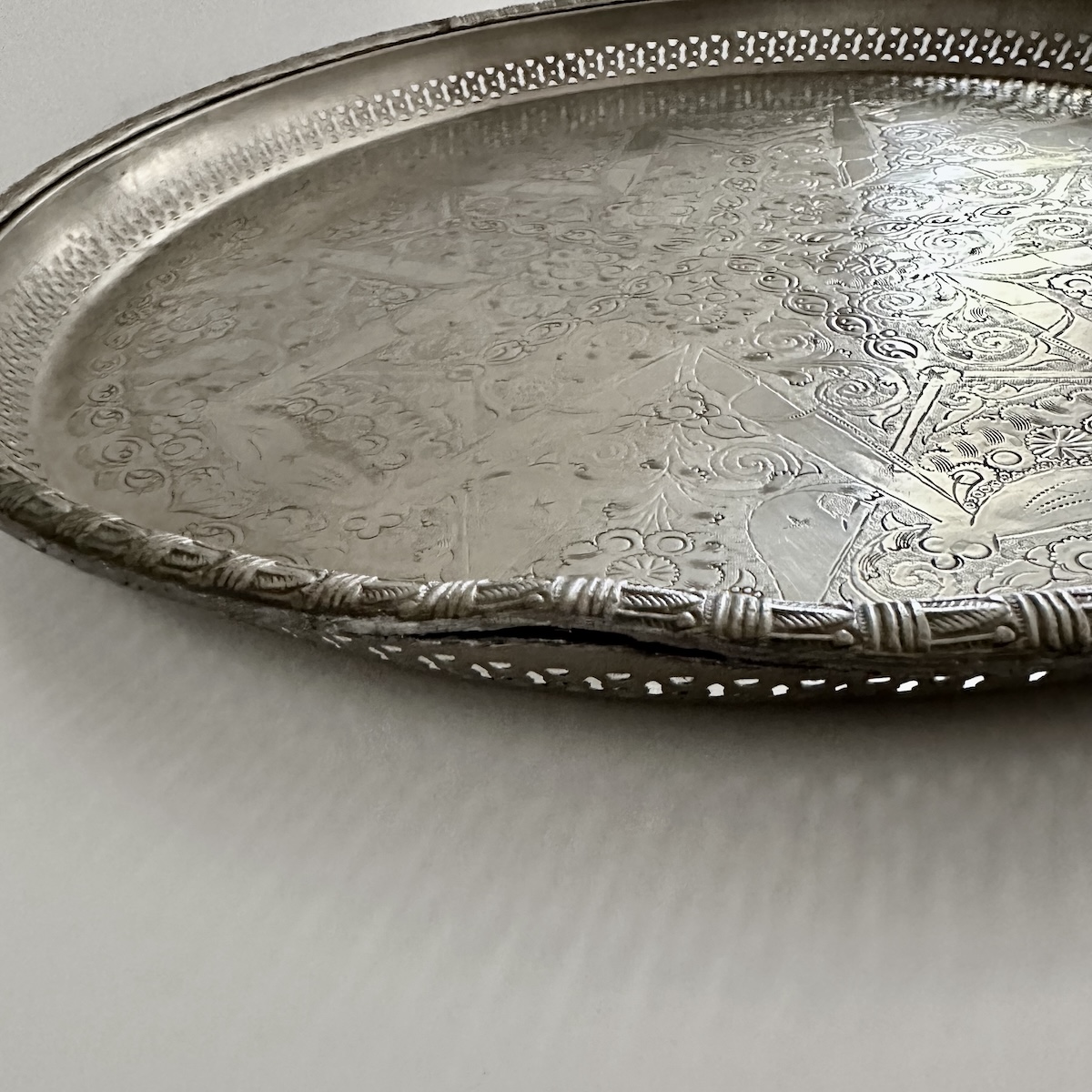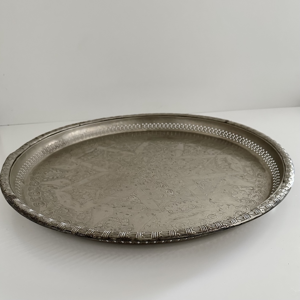 Det smukke marokkanske fad er minimum 60 år gammelt og håndlavet i nysølv/nikkelsølv! Her er tale om et UNIKA fund fyldt med masser af historie og sjæl! Fadet er desværre blevet bøjet lidt på et stykke af kanten under transporten fra Marokko – derfor sælges det som 2. sortering -50%.