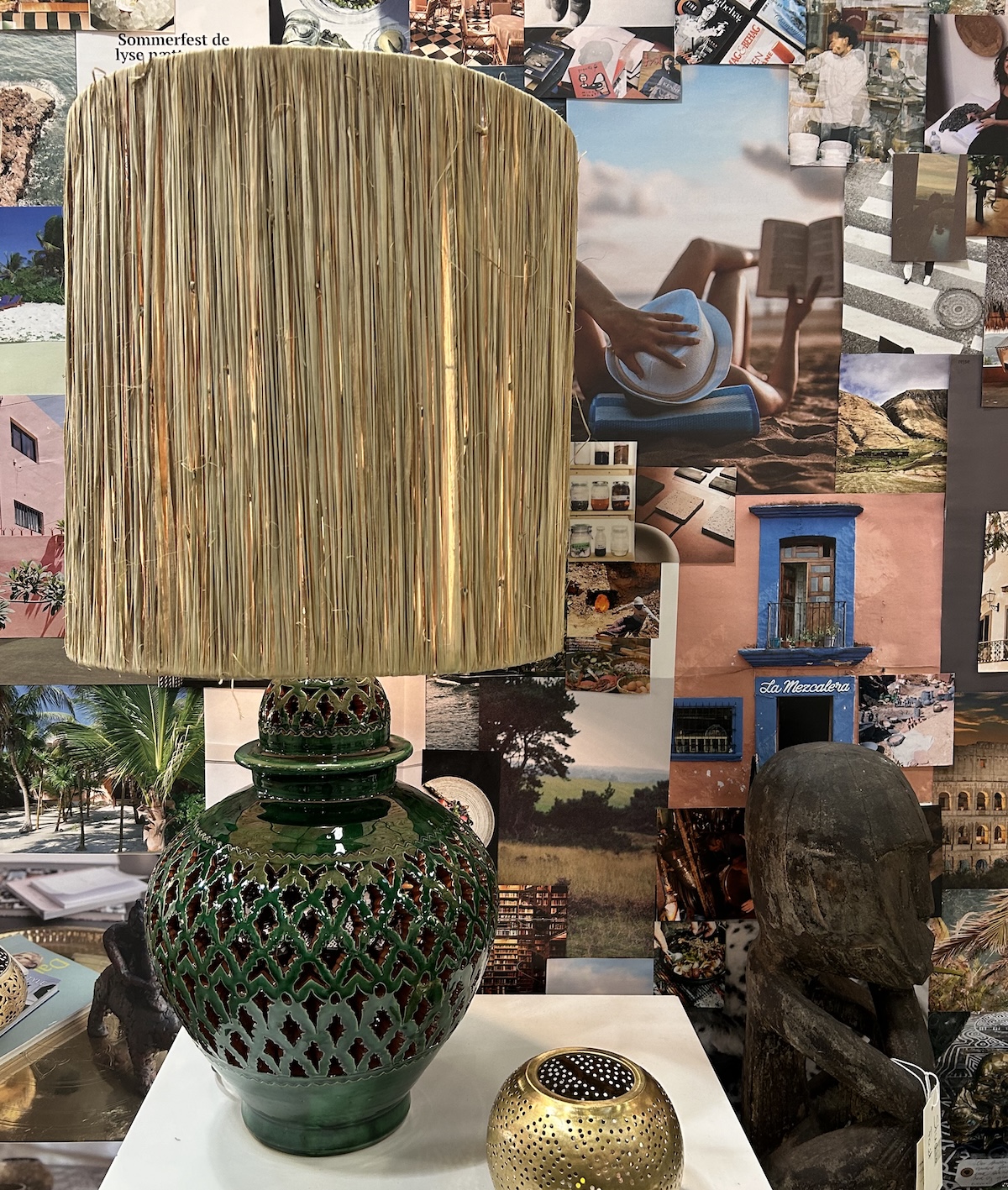 Palm lampeskærmen er en enkel, cylinderformet lampeskærm med et tvist af boheme. Skærmen er håndflettet i palmeblade fra Moder Natur af et lille familieejet team på Bali. Skærmen spreder et godt og hyggeligt lys ud igennem top og bund samt de flettede, lange blade.