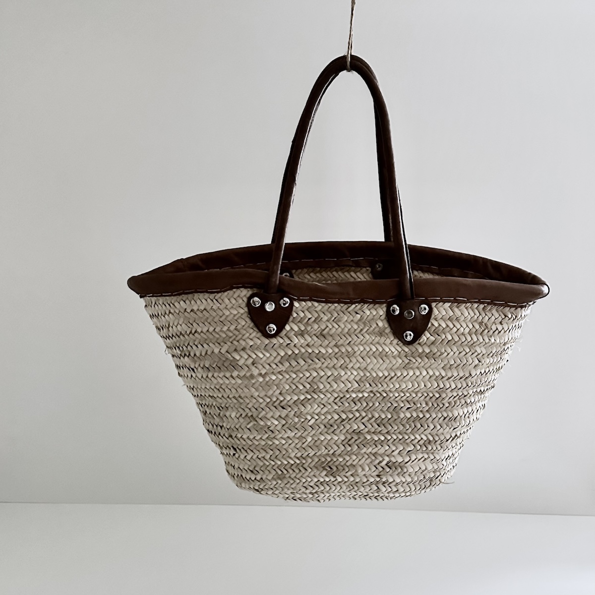 Skøn stor flettet kurvetaske i ovalt design med 2 kraftige hanke samt forstærket kant i lækkert cognacfarvet læder. Kurven er perfekt til shopping og indkøb, som en ekstra lille weekendtaske, til stranden – eller brug den som opbevaring af Hammam håndklæder eller toiletpapir på badeværelset, sko, ting på børneværelset, aviser, blade og meget andet. En classiker fra Marokko