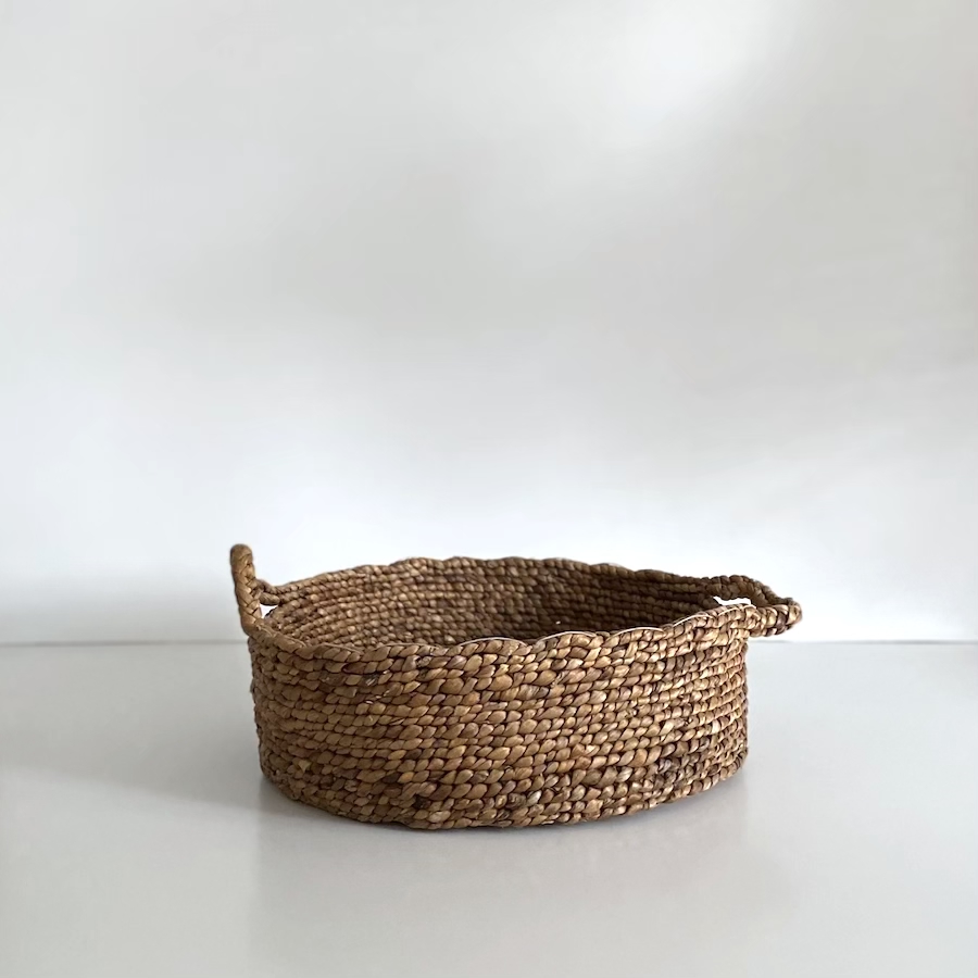 Lækker lille, rund kurv håndflettet i Marokko af naturlige palmeblade. Kurvene bruges oprindeligt som ‘mulepose’ til dyr, når de skal have mad. Deraf det marokkanske navn ALALFA. Kurvens lange hank, gør den anvendelig til ophængning; Men den er også charmerende at have stående blot med hanken hængende ned i siden.