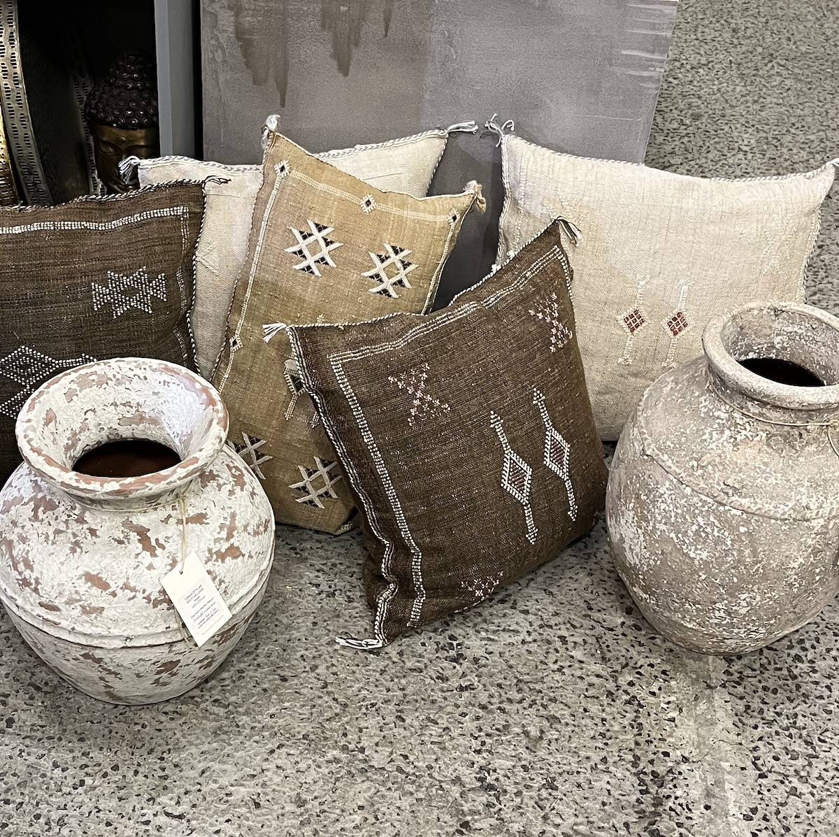Det smukke Cactus pudebetræk er håndfarvet og håndsyet efter gamle traditioner i Marokkos berber stammer. Som en del af det traditionelle håndarbejde er puderne vævet med indfarvede mønstre, farver, symboler og ikoner til beskyttelse og god energi. Vi elsker de smukke puder for deres autentiske design og den varme berber energi, hver eneste pude er med til at sprede i vores moderne bolig-og livsstil.