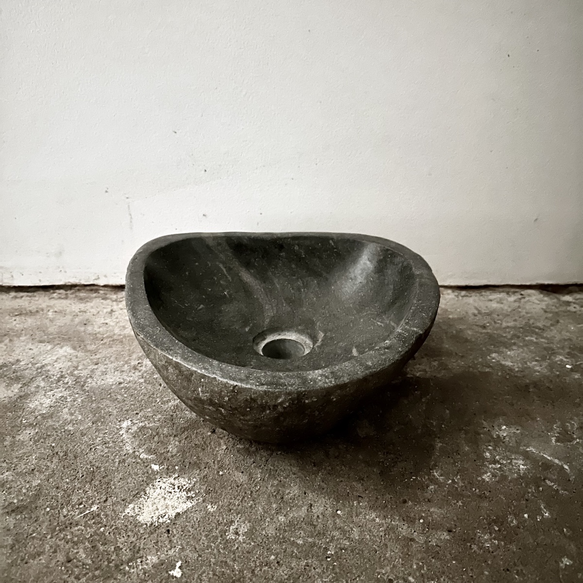 MATERIALE: Flodsten fra Bali – 100% naturprodukt. Indvendigt er vasken imprægneret med en tynd voksbelægning for beskyttelse mod kalk og snavs. FARVE: Grålig yderside – mørk inderside Stenen er skabt og præget af Moder Natur, hvilket giver Naturfarvet sten i grålige nuancer med en anelse brunlige og lyse aftegninger. Udvendig er stenen mat. Indvendigt har slibning samt pudsning med et tyndt lag voks givet vasken en mørk transit grå farve med en anelse blank finish. OPRINDELSE: Håndskåret på Bali, Indonesien. Stenen er et stykke af Moder Natur, som manuelt er blevet udhulet, slebet, pudset samt afslutningsvist imprægneret til den smukkeste håndvask med en glat, vandafvisende overflade på indersiden. Da stenen er manuelt udskåret er indersiden ikke 100% jævnt udhulet, hvilket er en del af den autentiske charme. VEDLIGEHOLDELSE: