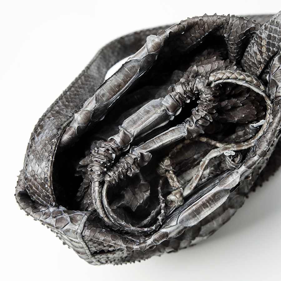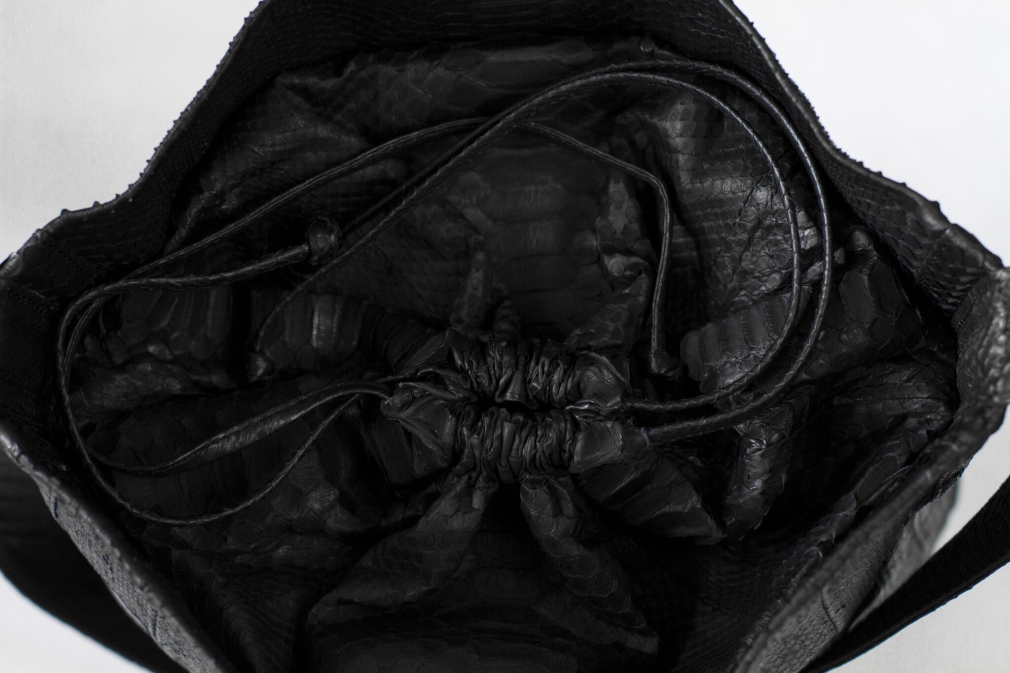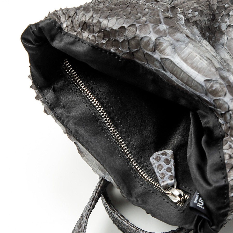 * Lukkes med en indvendig snørrepose i python skind – et råt og afslappet alternativ til en lynlås, der giver tasken en større fleksibilitet og rummelighed. Lad den lille snørrepose stikke op over taskens kant (åben eller snørret) eller buk posen ned langs taskens indvendige side. Du bestemmer selv hvor afslappet og råt et look, du ønsker.