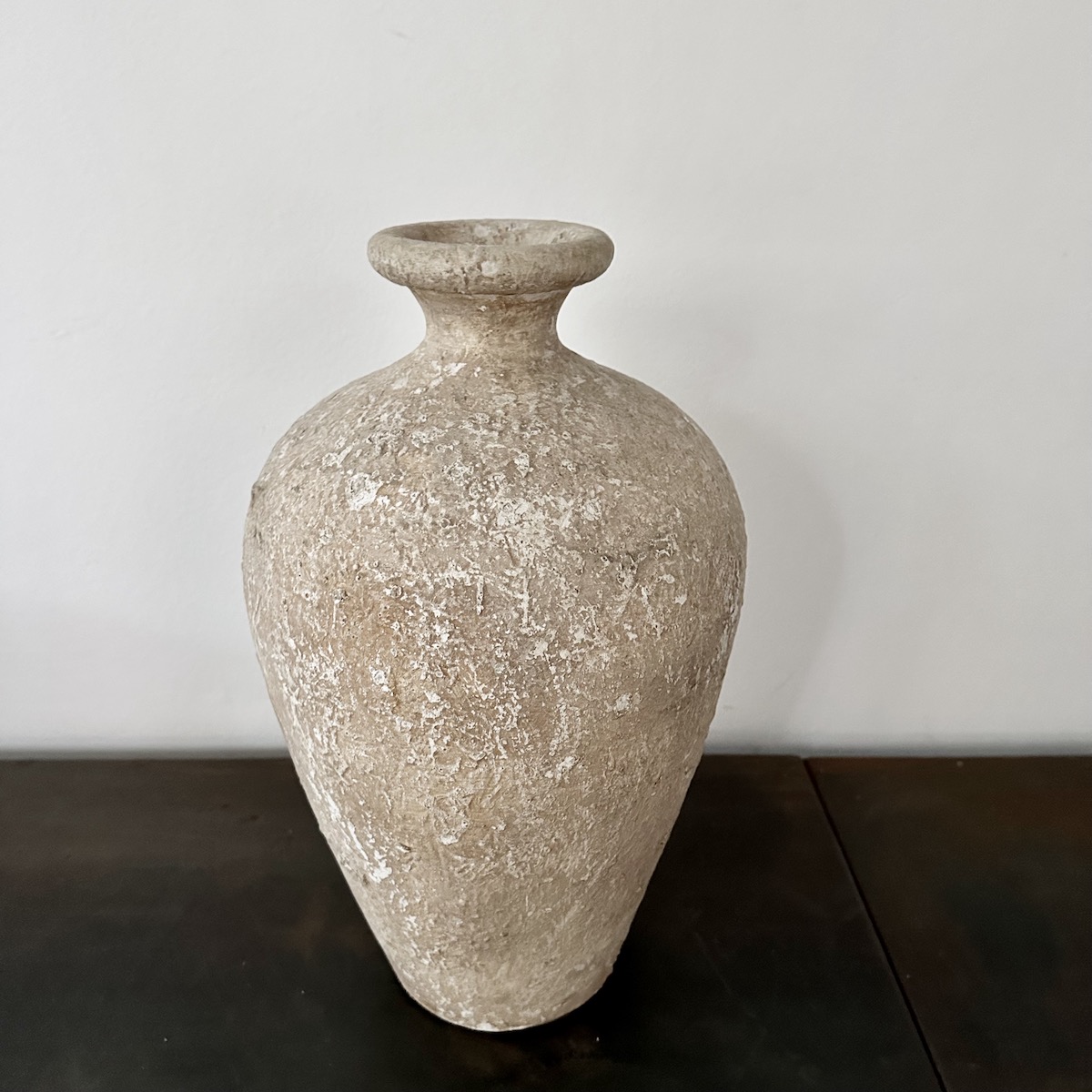 Smuk høj og slank terrakotta krukke i klassisk afrundet facon med lille hul foroven. Krukken er crafted i ler fra Moder Natur i en råhvid melering. Krukken er skabt i små workshops på Java og Bali i Indonesien, drevet af en kvindelig entreprenør.