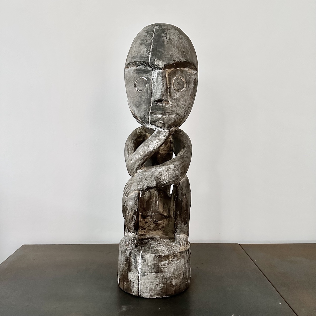 Vi synes, figuren er både smuk og fascinerende. Rå og enkel på en og samme tid. Og så udstråler den en ro, en eftertænksomhed og en ‘hvilen i sig selv’, der gør, at man ikke kan lade være med at kigge på den lille mand. Han sidder helt centreret, roligt og rankt på et plateau med hovedet hvilende i den ene hånd. Næsten som en lille abe, der tager sig en pause efter en sjov leg med de andre. Energien er samlet omkring ham selv og hans tanker, mens han betragtende funderer over livet. Den lokale snedker har lavet et smukt og enkelt stykke håndværk, som vi gerne selv vil have stående på en særlig plads i vores hjem. Fyldt med god energi fra den magiske og spirituelle ø – Bali ♥