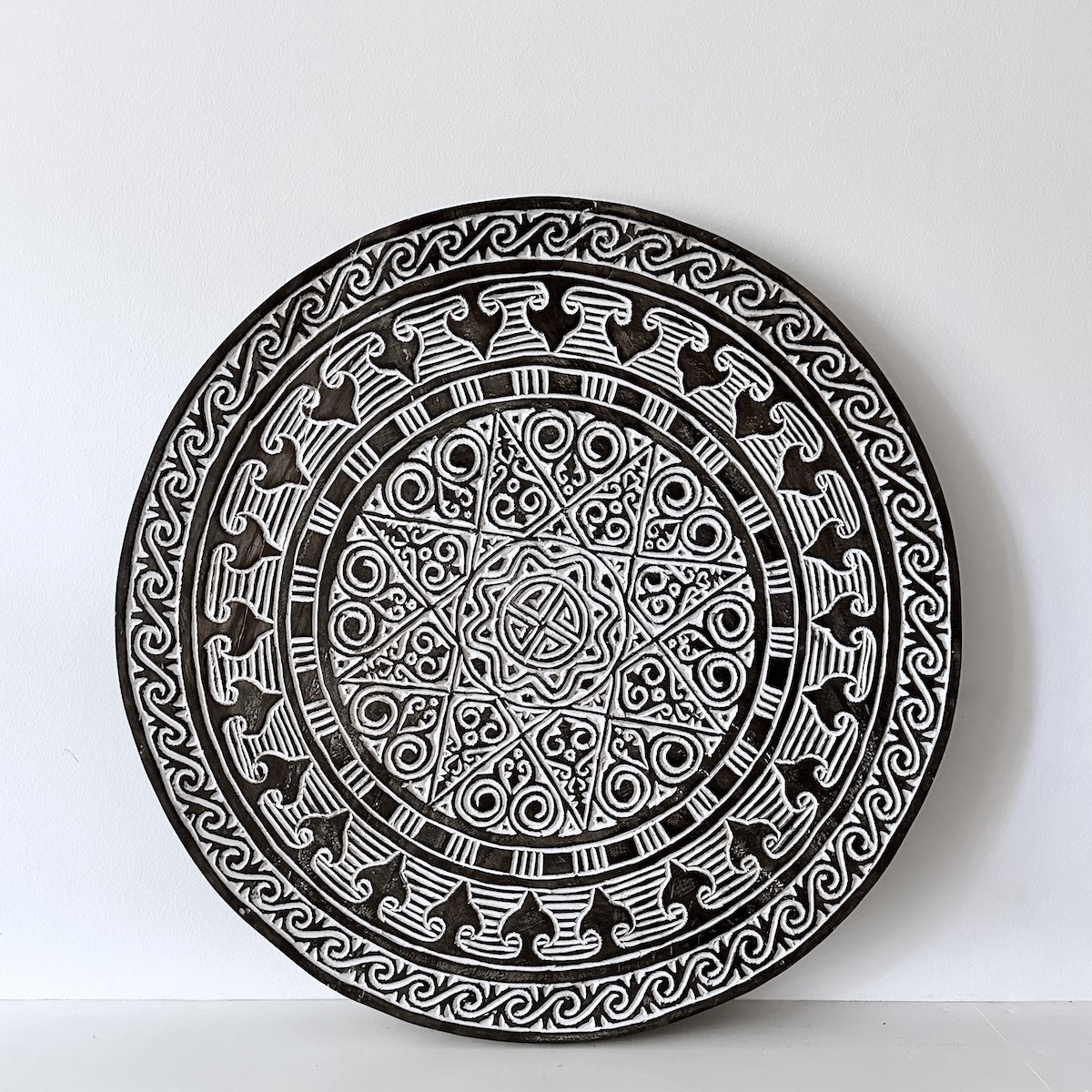Timor coffee sofabord – Ø60 cm STØRRELSE: Ø60Cm x H30cm. MATERIALE: Bæredygtigt, hurtigtvoksende suar træ fra de indonesiske skove – med certifikat fra FLEGT og den danske Miljøstyrelse FARVER: Naturligt suar træ samt mønstre optegnet med hvid maling ORIGIN: Håndlavet på Bali efter gamle traditioner fra den indonesiske naboø, TIMOR