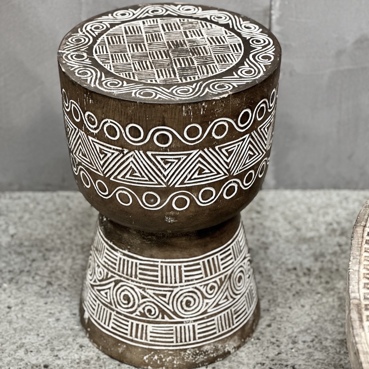 Timor skammel H45 cm STØRRELSE: Ø30 x H45 cm MATERIALE: Hurtigtvoksende suartræ fra de indonesiske skove og jungleområder –  med certifikat fra FLEGT og den danske Miljøstyrelse FARVER: Naturligt suartræ påført en anelse mørk bejsefarve. De udsnittede ikoner og mønstre er optegnet med hvid maling ORIGIN: Håndlavet på Bali efter gamle traditioner fra den indonesiske naboø, TIMOR