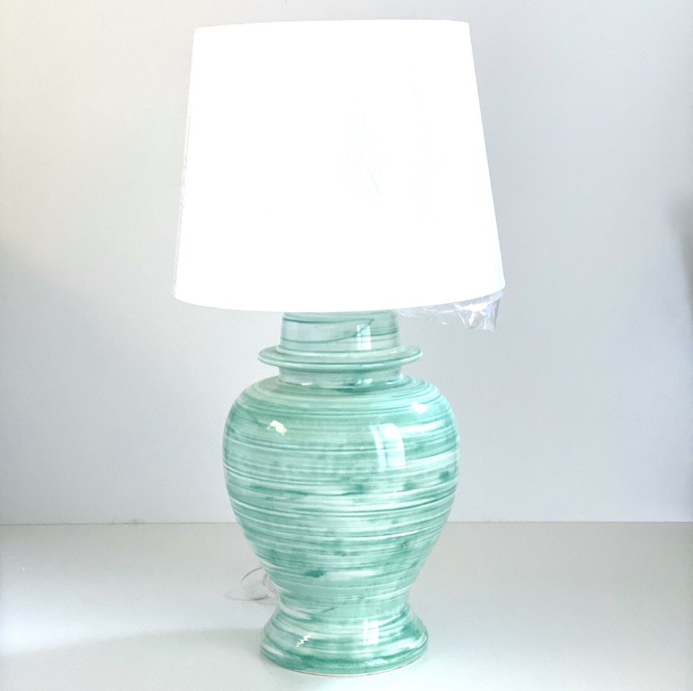Den charmerende bordlampe i den lækre mint grønne /turkise farve med hvide brush striber leder tanken hen på en varm sommerdag ved havet. Lampefoden er håndstøbt i en lille lokal workshop i Andalucien i det sydlige Spanien. Min familie og jeg har rejst i regionen i mange år, og vi elsker de skønne keramiktraditioner, der er gået i arv fra generation til generation.