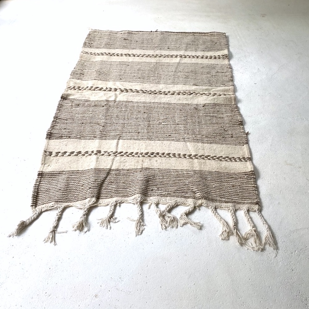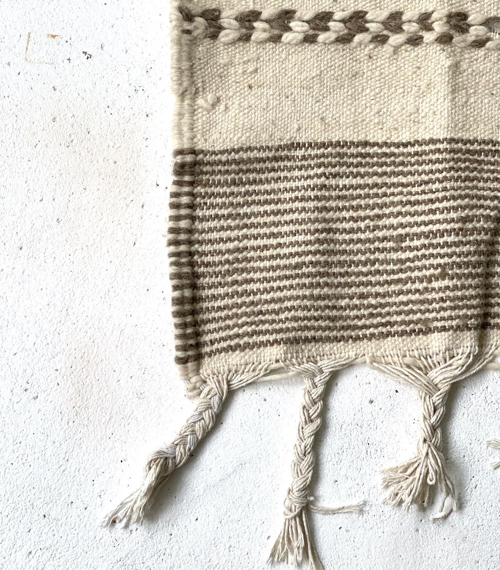 Zanafi Kilim gulvtæppe 150 x 100 cm creme / brun – assorterede STØRRELSE: L 150 cm x B 100 cm. Målene er cirkamål MATERIALE: Håndvævet i 100% rent fåreuld i naturligt råhvidt og brunt uld – kartet fra fåreflokkene i Atlasbjergene i Marokko i de varme sommerperioder FARVE & DESIGN: Zanafi tæppet er et kelim tæppe, der er håndvævet efter de gamle traditioner fra Zanafi stammebefolkningen i Marokko. Typisk for stammens traditioner er tæppet vævet i ren uld i 2 farver – her fra brune og råhvide får. Og som alle Zanafi tæpper er tæppet vævet, så det kan vendes om og bruges på begge sider! Tæppet er vævet med lange, horisontale rækker med en lille 3D effekt, der typisk afspejler den kvindelige Zanafi vævers fortolkning af det omkringliggende landskab.  HVERT TÆPPE ER UNIK! Da tæppet er håndvævet i naturligt fåreuld, kan der forekomme variationer og uensartet vævning i faconen, mønstre, brug af farver mm. ORIGIN: Håndvævet efter de gamle traditioner fra Zanafi stammen i Atlasbjergene, Marokko.