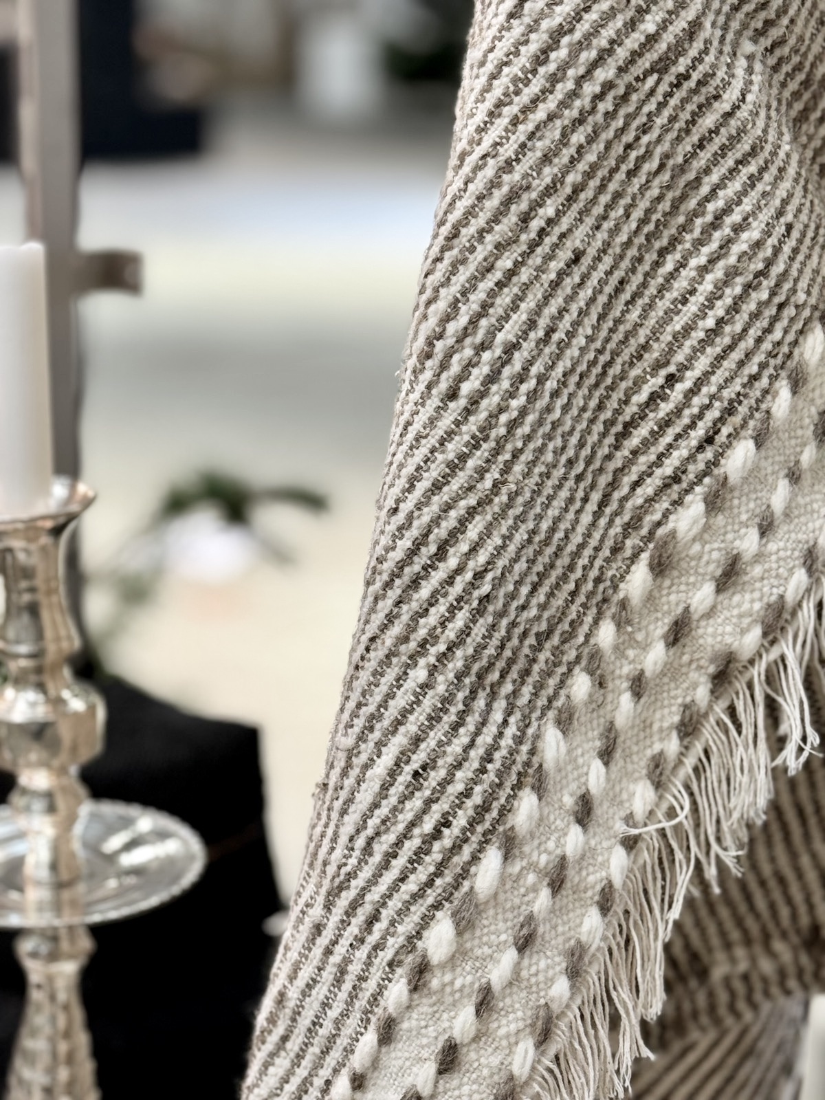 Tæppet er håndvævet af Zanafi berberstammerne i Atlasbjergene i Marokko i ren uld fra de græssende får. Zanafi stammerne er kendte for deres horisontale striber og border, der afspejler væverens fortolkning af livet og det omkringliggende bjerglandskab. Derudover indvæver de tynde stykker ‘siv’, der hjælper med at styrke tæppet og giver det et mere råt look. Der er oftest særligt knyttede frynser i den ene ende samt i siderne, hvor garnet afsluttes. Hvert tæppe følger Zanafistammernes DNA for tæppernes vævning og struktur; Men som noget helt unikt efterlader hver kvinde sin egen personlige signatur som en charmerende hilsen til den heldige modtager. Nogle gange i form af en unik bort, en særlig knytning af frynserne. Og altid i form af en eller flere små, farvede tråde, der er indvævet i tæppet til healing, beskyttelse og god energi.